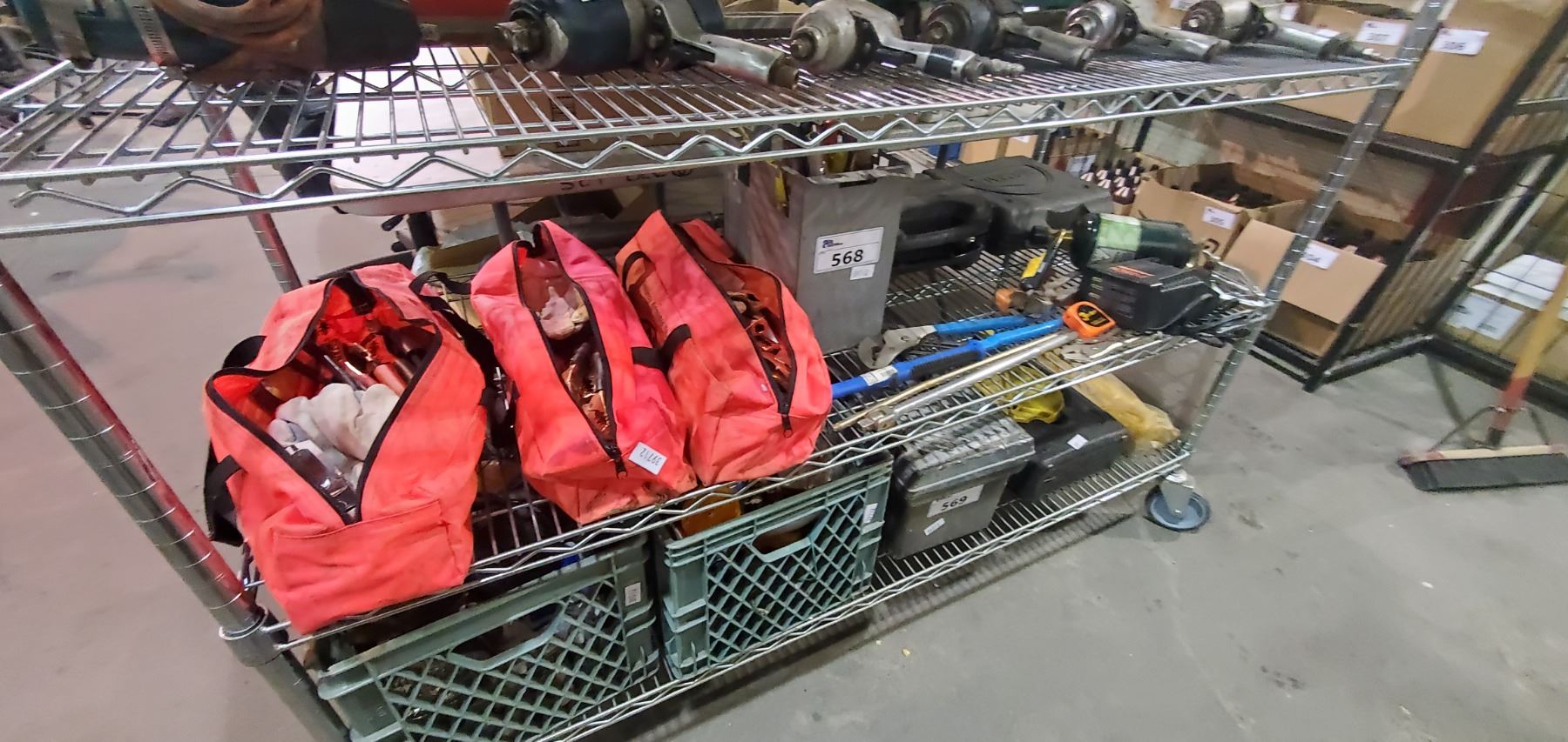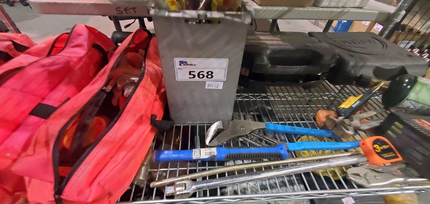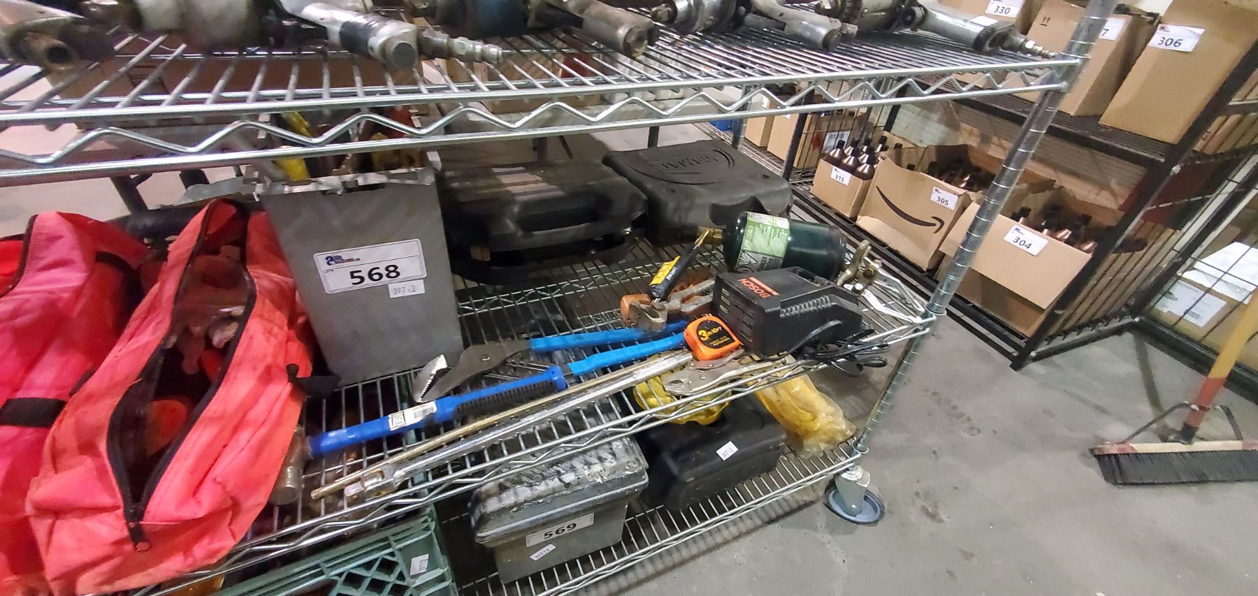 SHELF LOT OF ROAD SIDE ASSISTANCE KITS, PROPANE TORCH, PLIERS, AND MORE