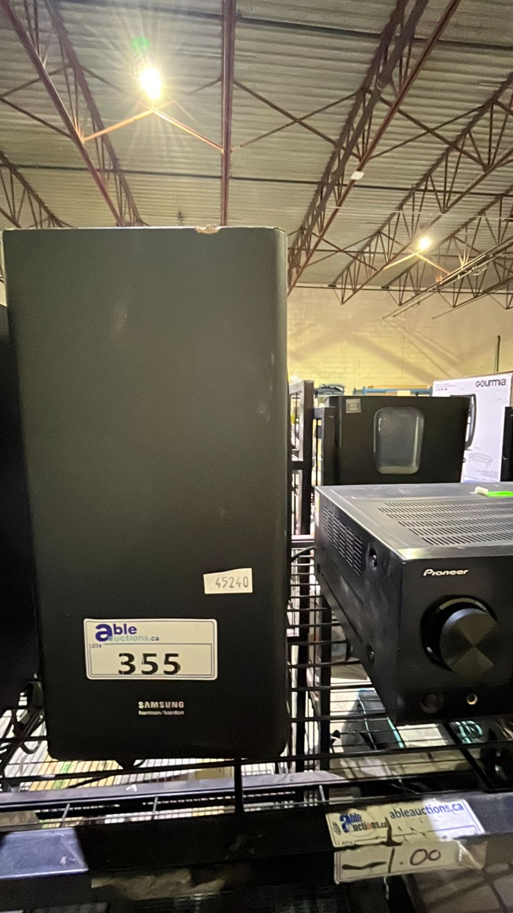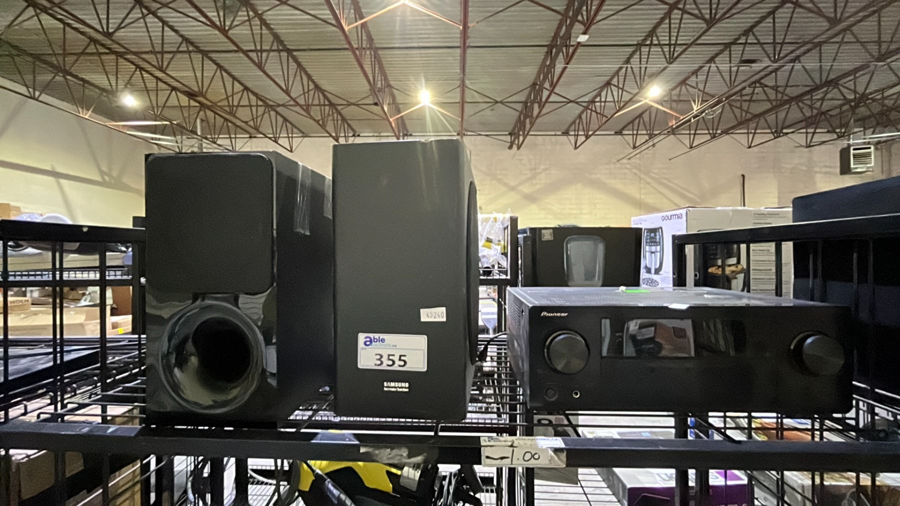 SHELF LOT OF SAMSUNG AND SONY SUBWOOFERS AND PIONEER AV RECEIVER *UNKNOWN WORKING CONDITION/ MAY BE MISSING PIECES*