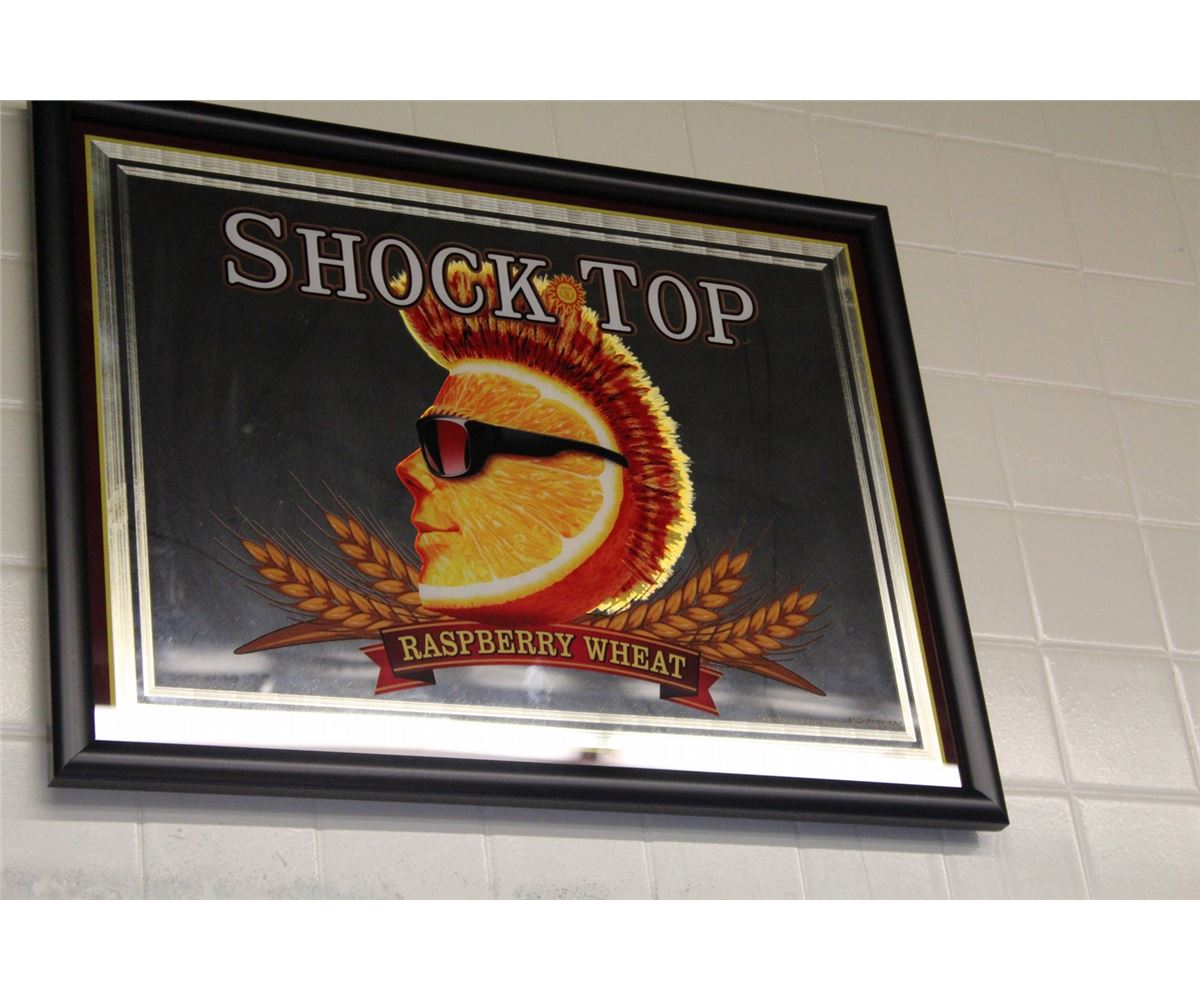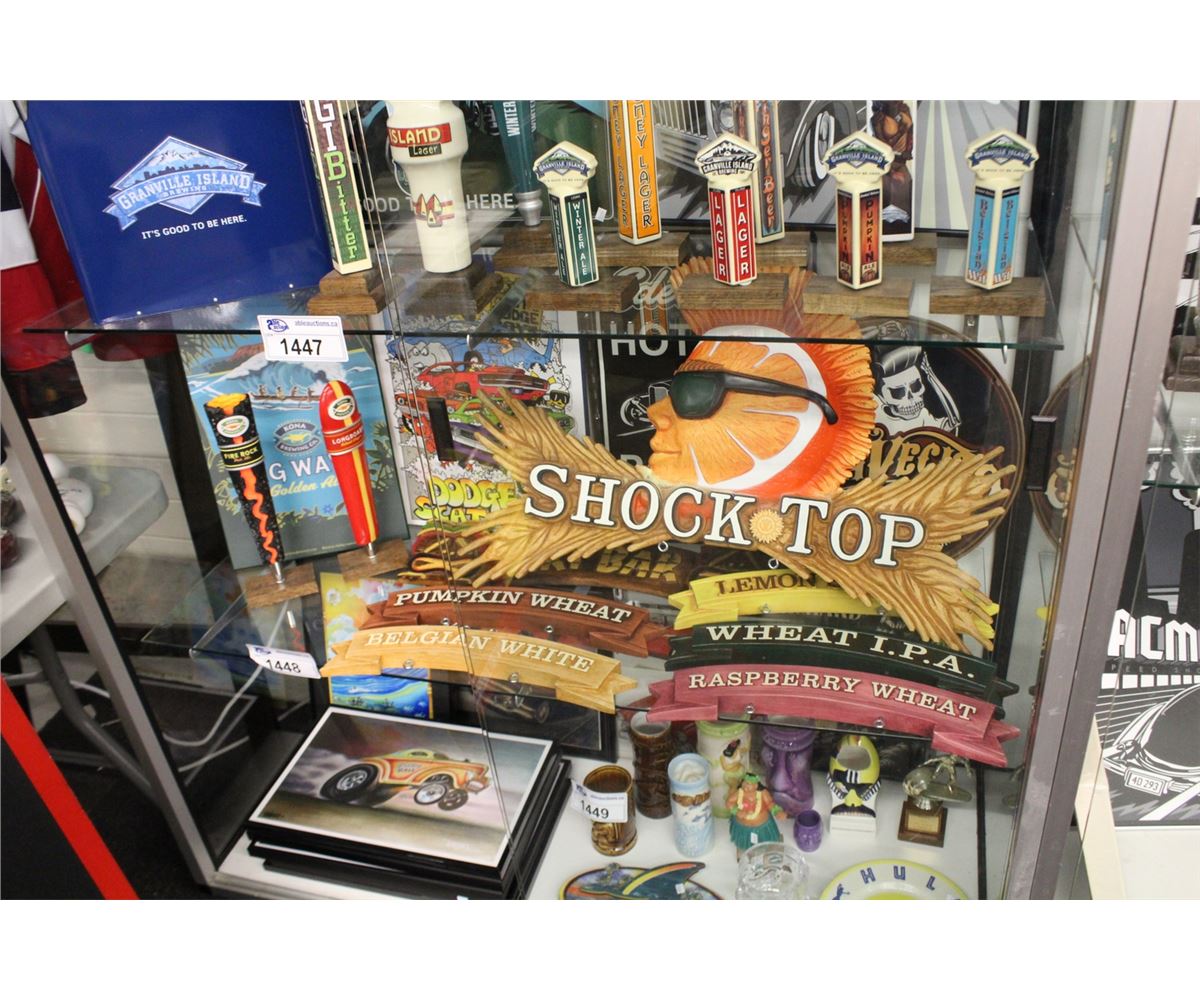 SHELF LOT OF SHOCK TOP HANGING FIXTURE BEER SIGN, TWO BEER TAPS, SHOCK TOP MIRROR AND VARIOUS SIGNS