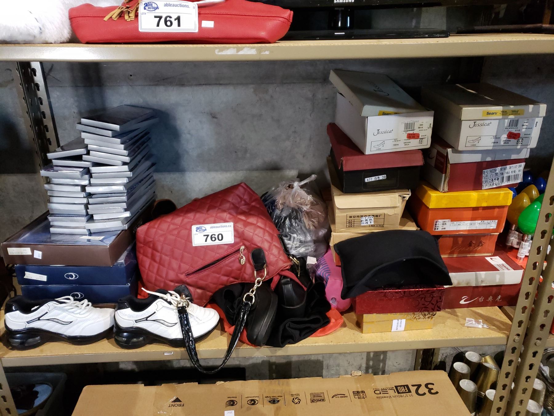 SHELF LOT OF SHOES, PURSES, NEW NECKTIES AND MORE