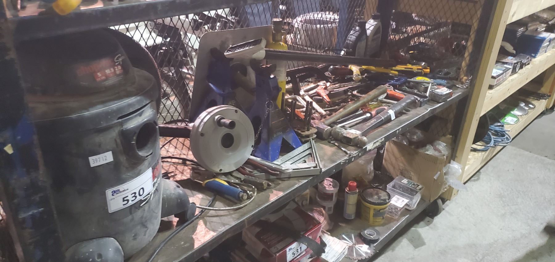 SHELF LOT OF SHOP VAC, RIGID SNAKE, JACK STANDS, AND MORE