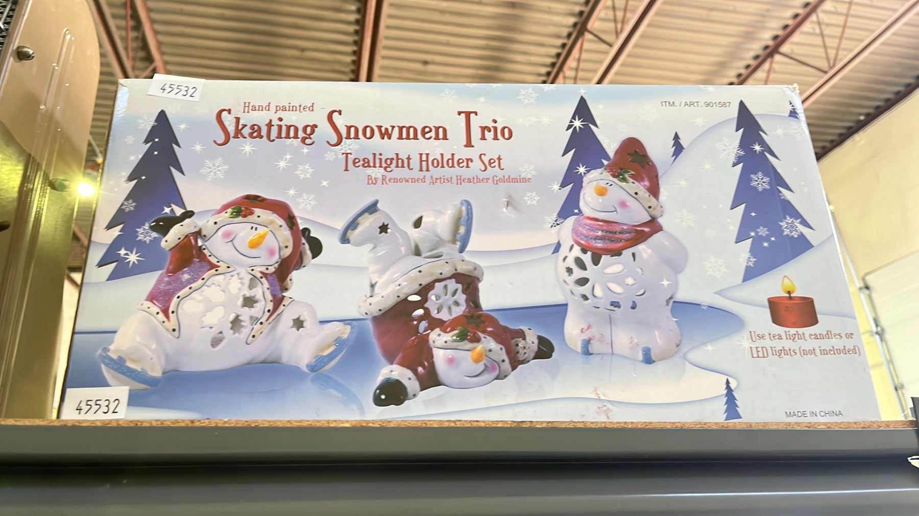 SHELF LOT OF SKATING SNOWMAN TEALIGHT HOLDERS, MARKEL HEATER AND MORE