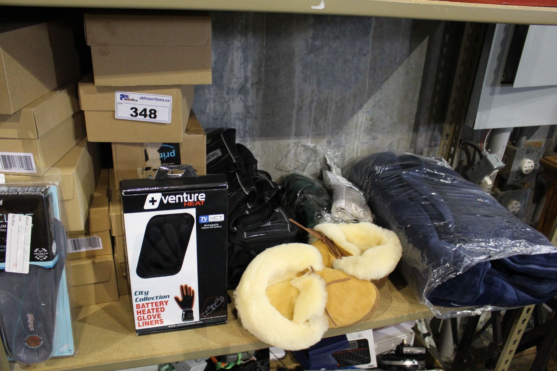 SHELF LOT OF SLIPPERS, HEATED GLOVES, HEATING PADS AND MORE