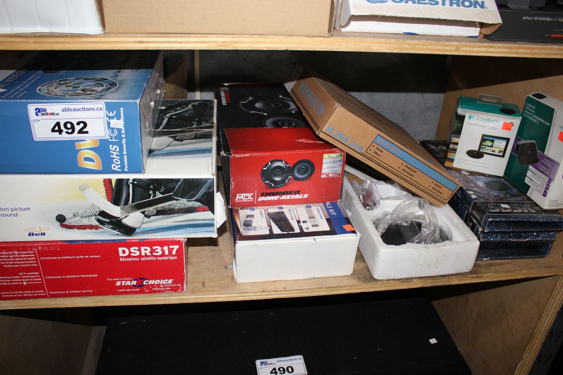 SHELF LOT OF SOUND SYSTEMS, RECEIVERS, DVR, AND MORE