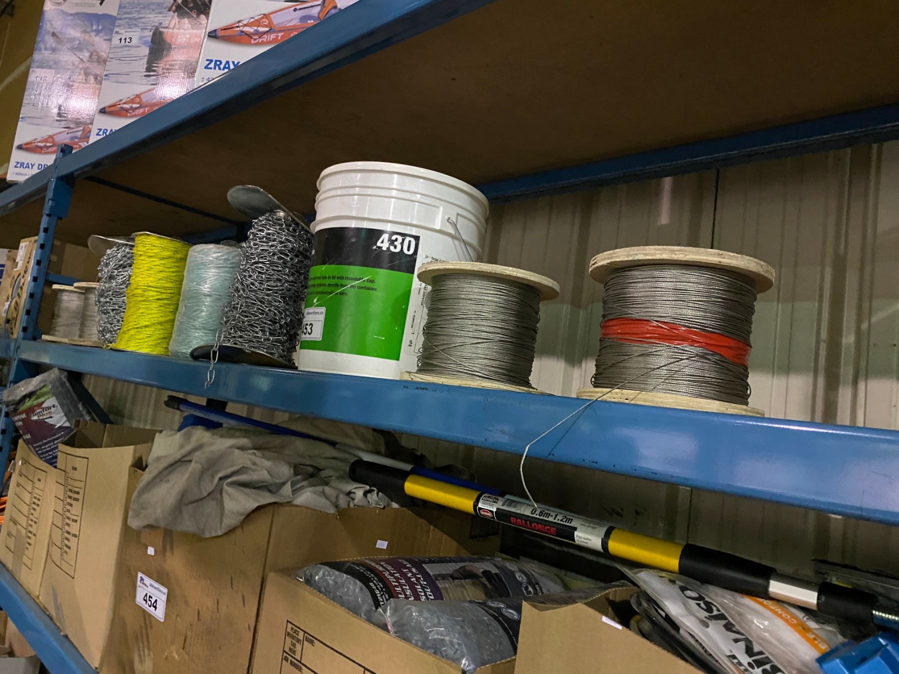 SHELF LOT OF SPOOLED CABLE & CHAIN AND ROPE