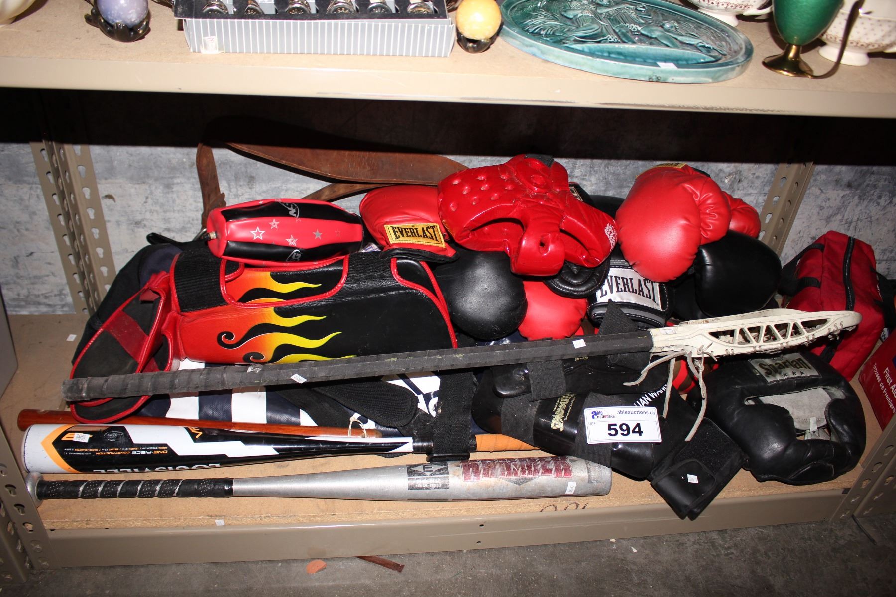 SHELF LOT OF SPORTING GOODS INCLUDING BOXING GEAR, BASEBALL BATS AND LACROSSE STICK