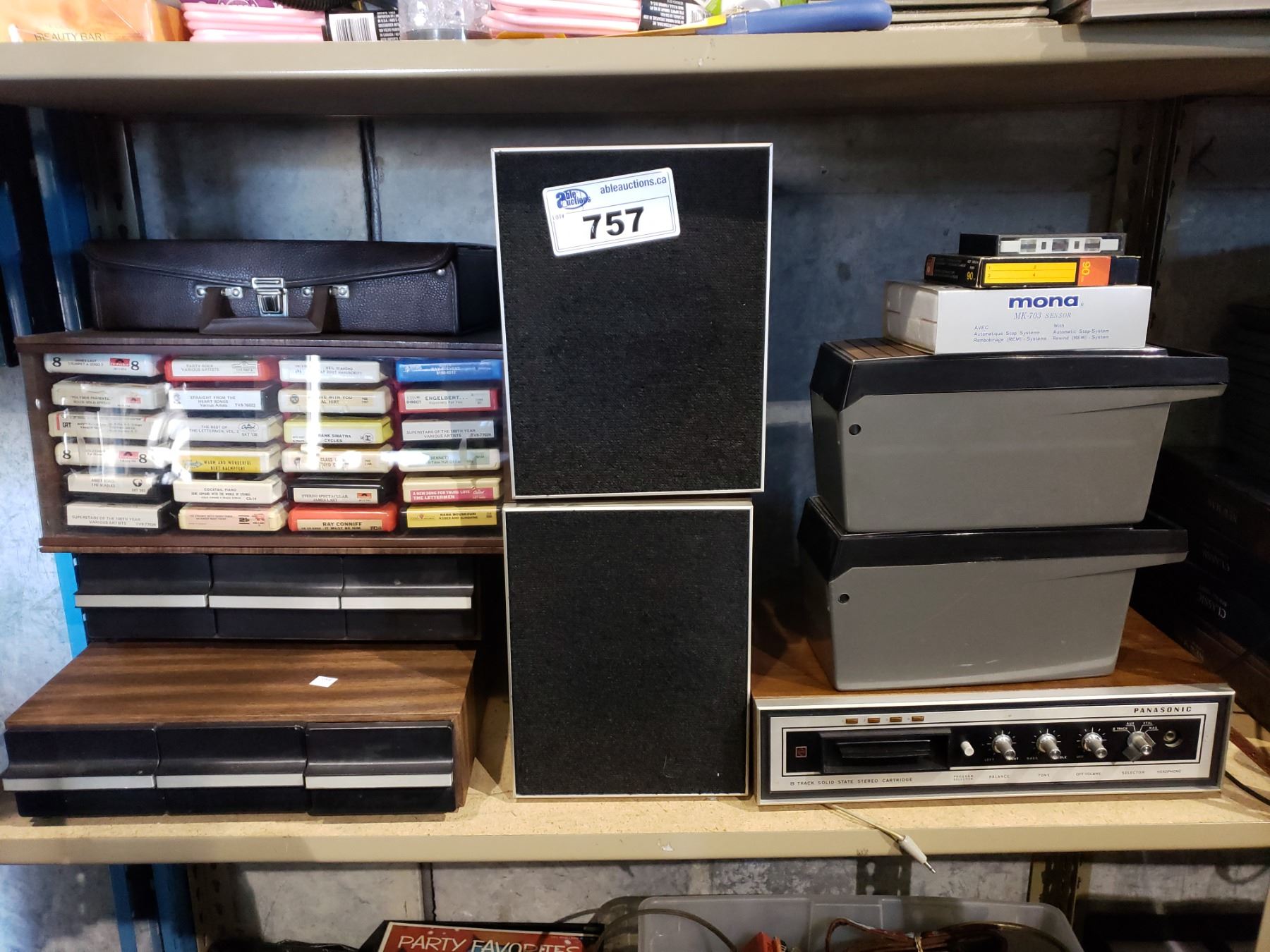 SHELF LOT OF TAPES, TAPE HOLDERS, PANASONIC RECEIVER AND MORE