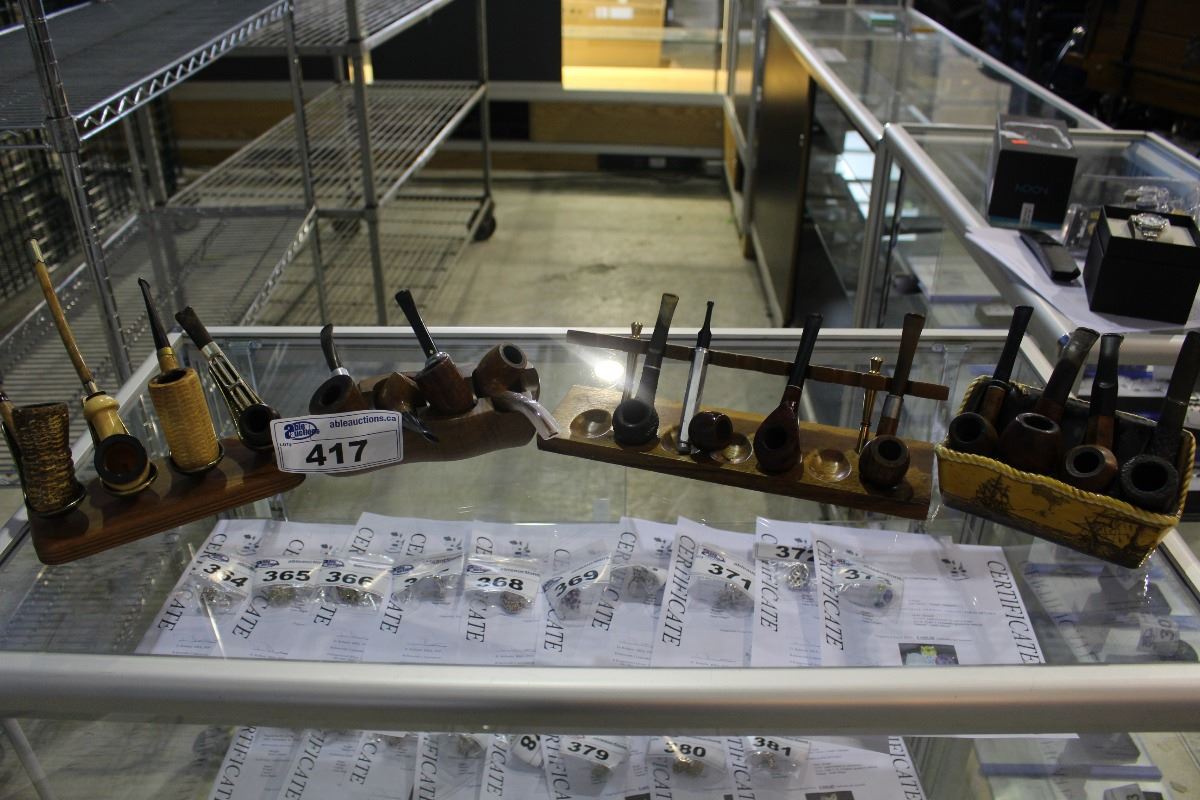 SHELF LOT OF TOBACCO PIPE STANDS WITH PIPES
