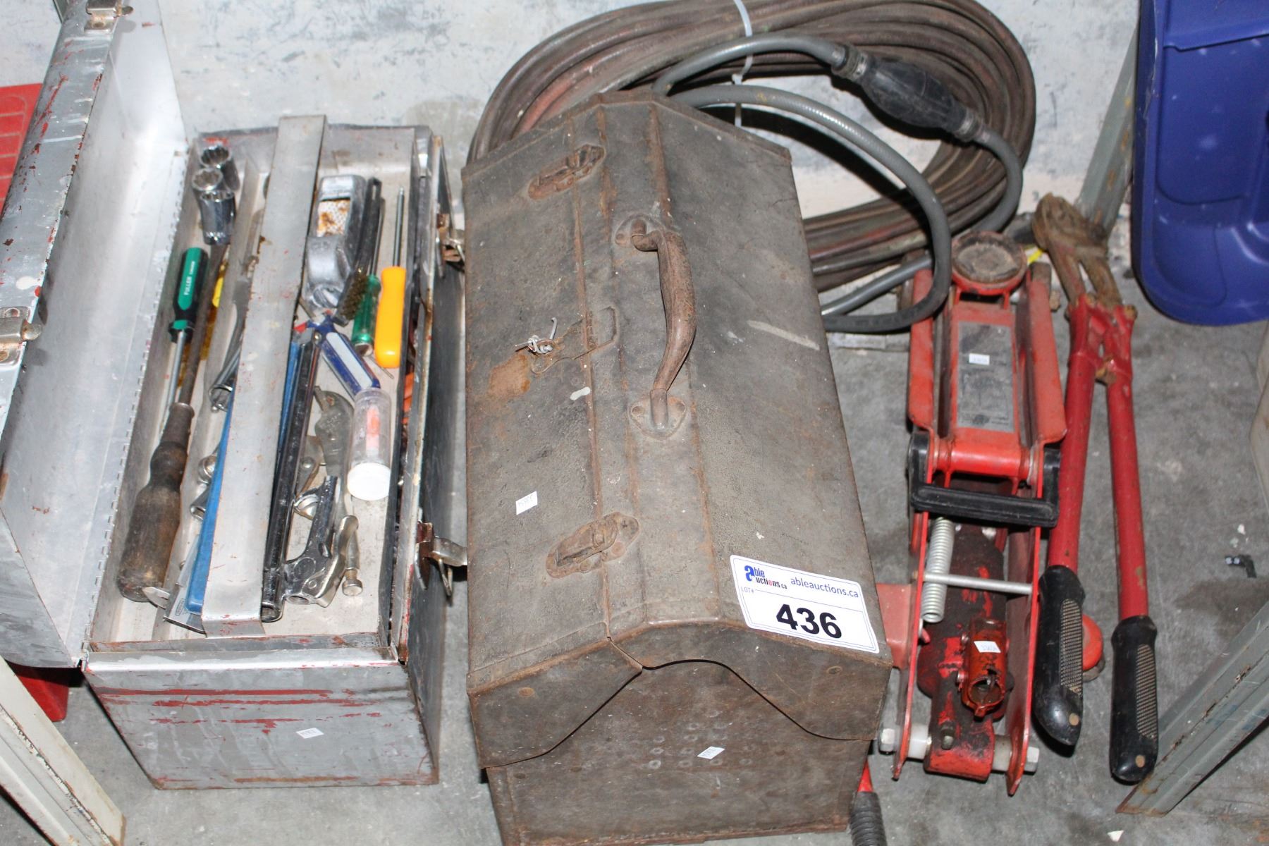 SHELF LOT OF TOOL KITS AND TOOL BOXES AND FLOOR JACK