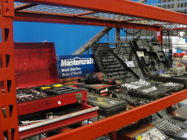 SHELF LOT OF TOOLS; AI R IMPACT WRENCH SETS, SOCKET SETS, PORTER CABLE PROFESSIONAL AIR NAILER, ETC