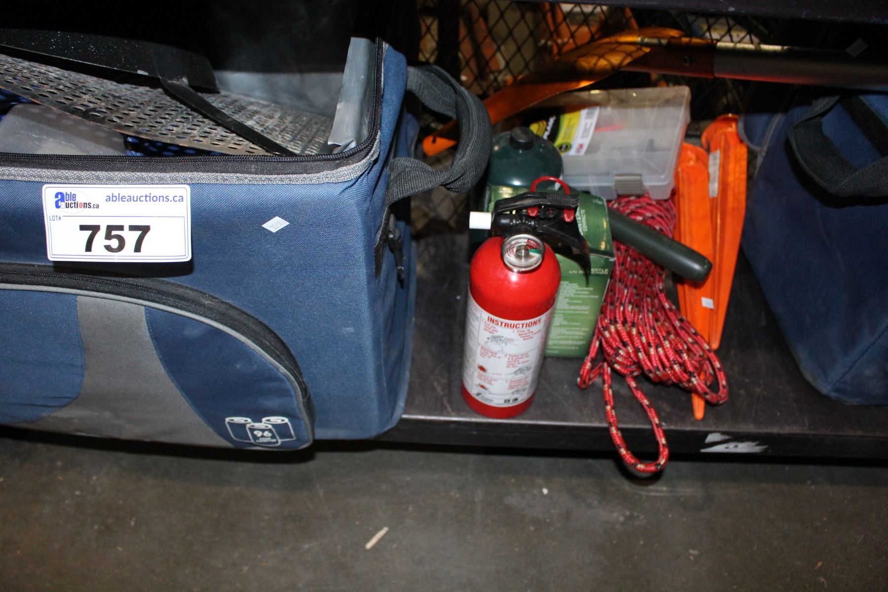 SHELF LOT OF TOOLS, FISH EXTINGUISHERS, ROPE AND MORE