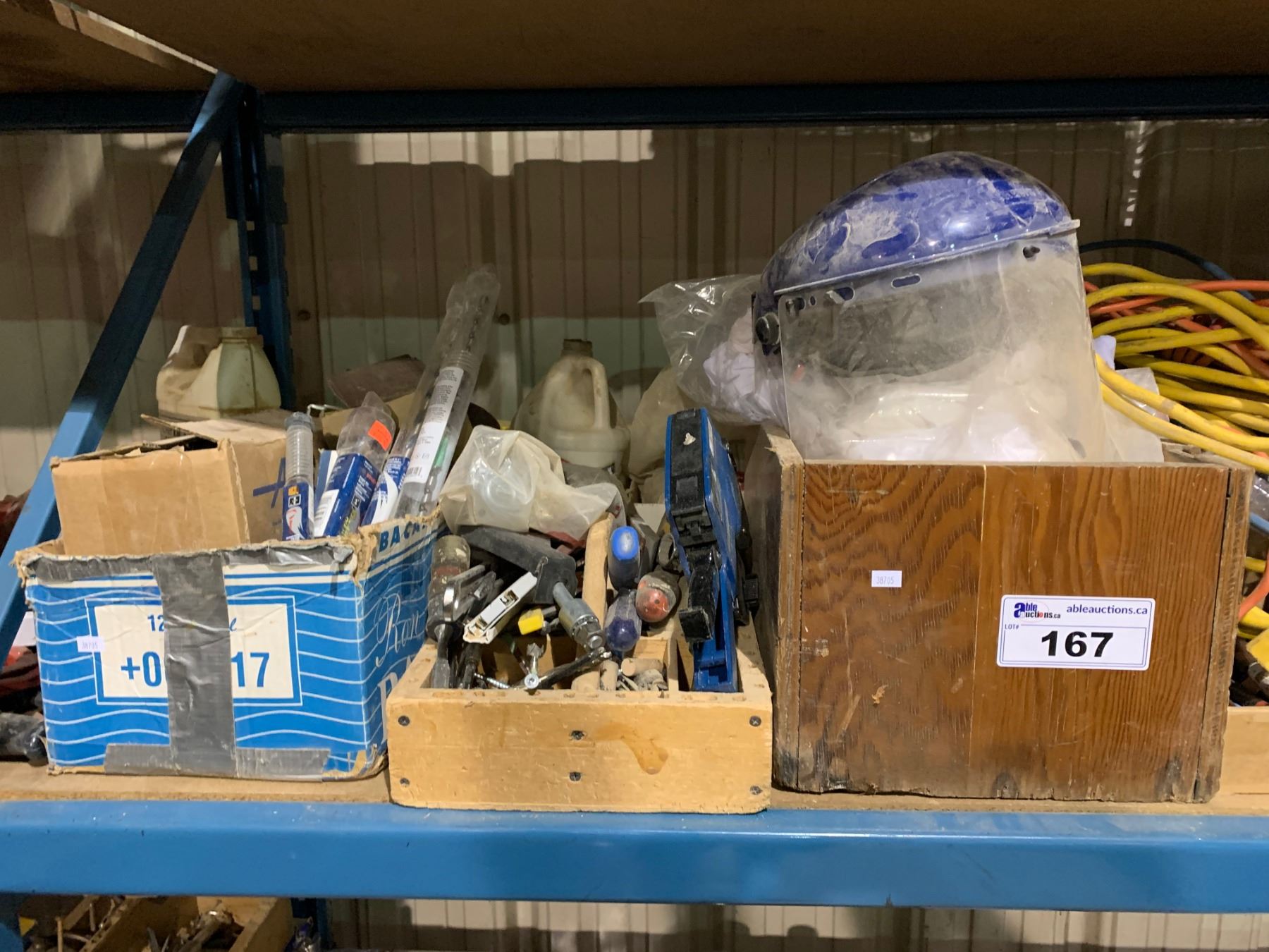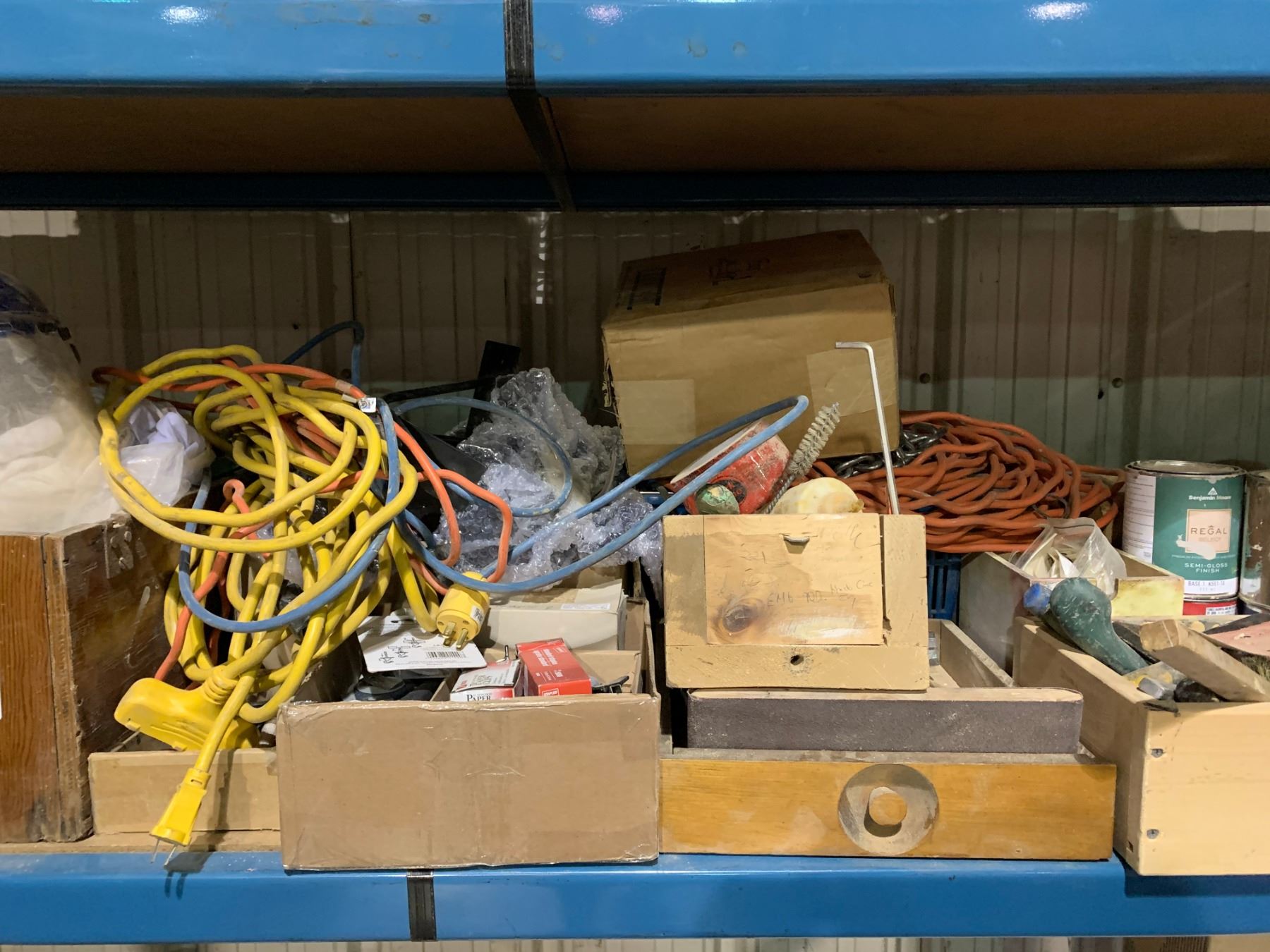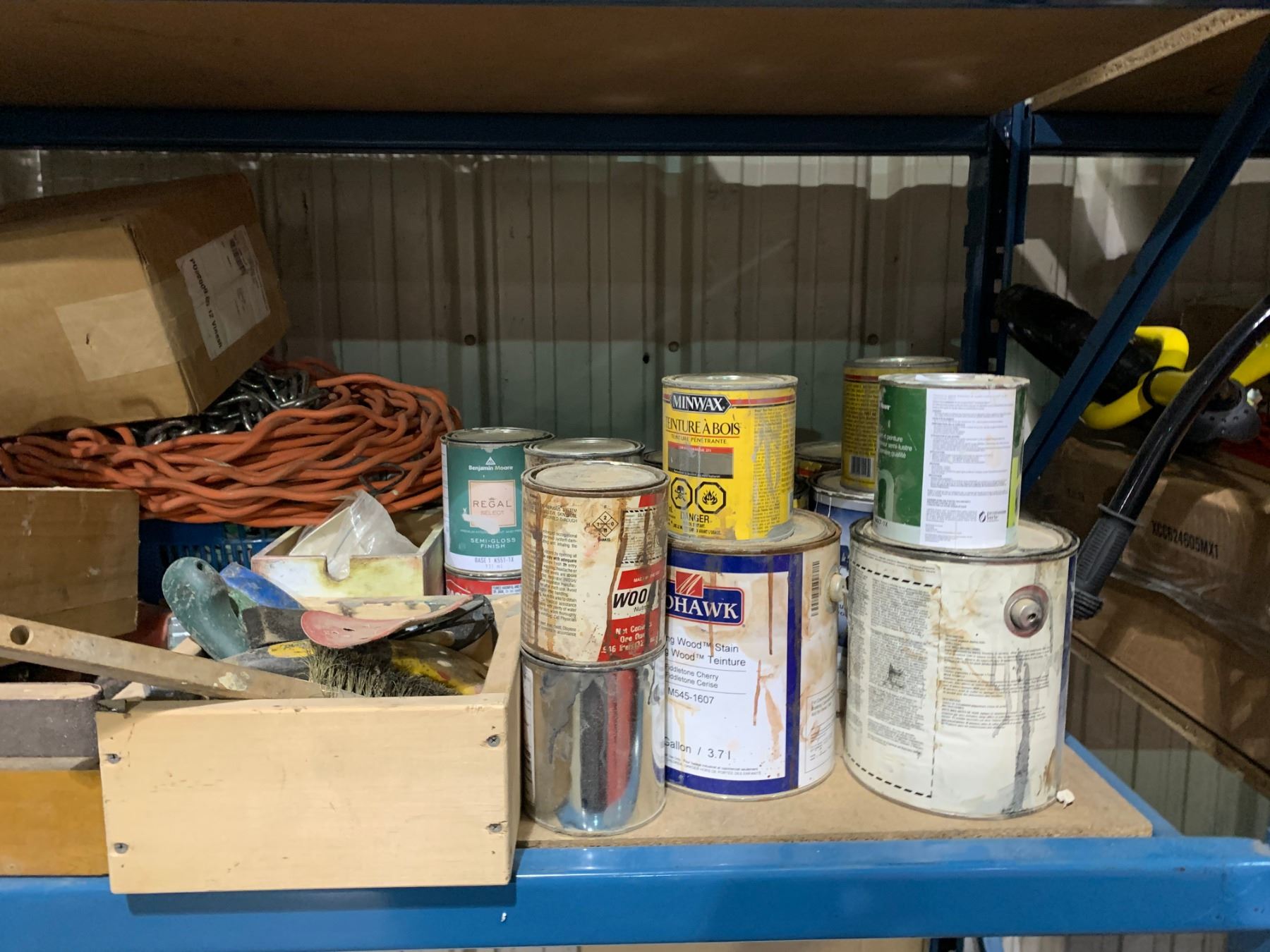 SHELF LOT OF TOOLS, HARDWARE & STAIN