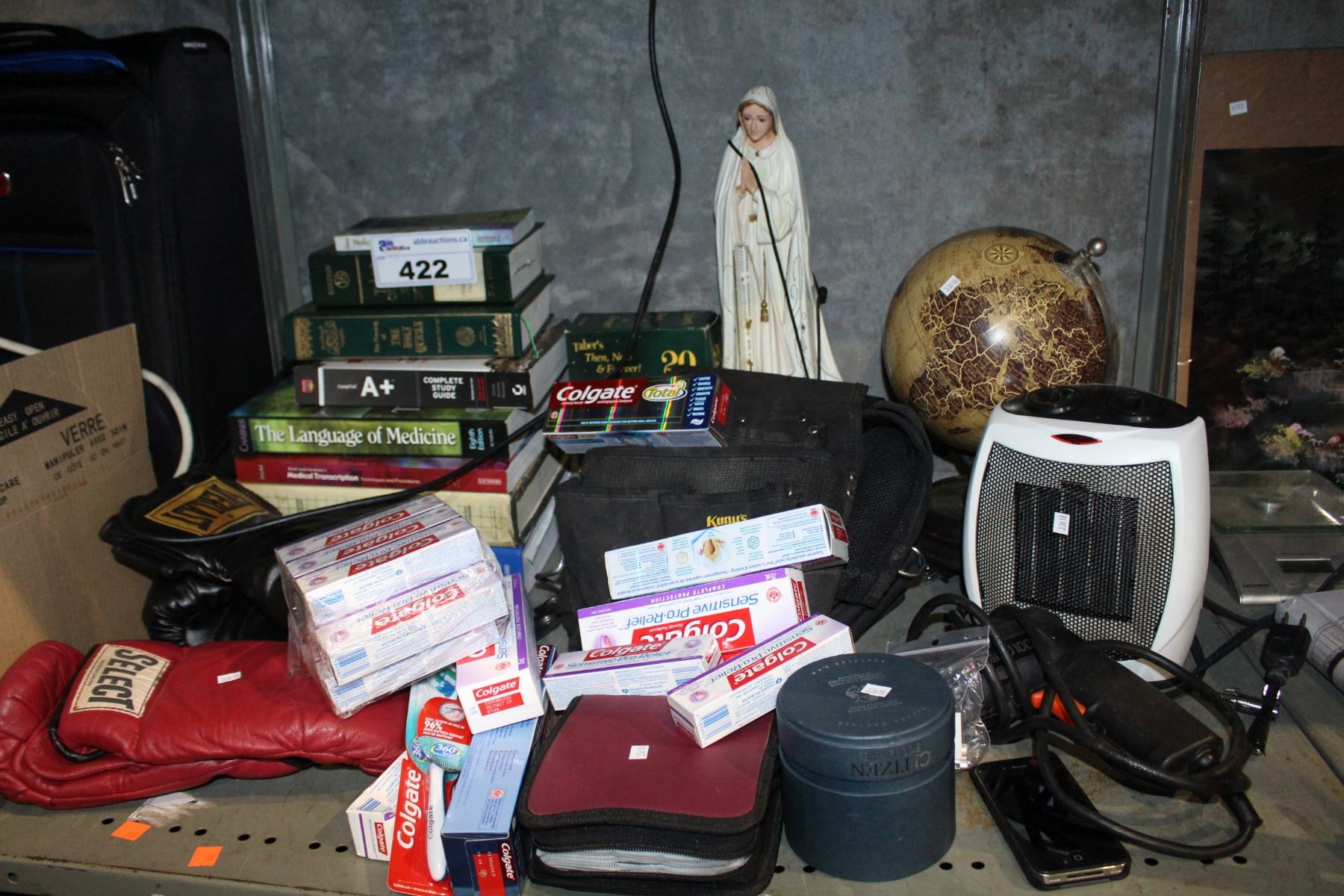 SHELF LOT OF TOOTHPASTE, CERAMIC HEATER, GLOBE AND MORE