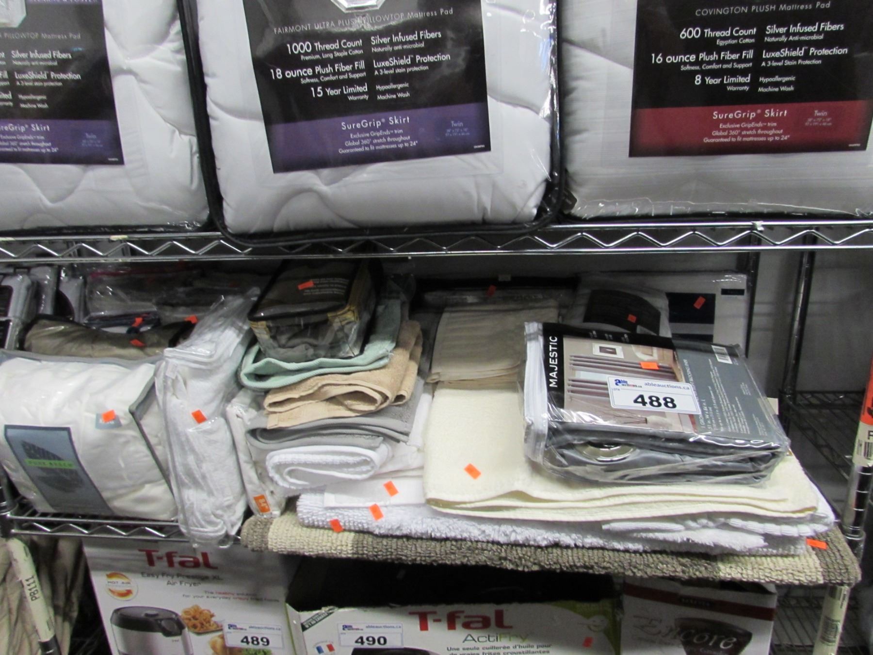 SHELF LOT OF TOWELS, SHOWER RUGS, FACE CLOTHS, CURTAIN PANELS & ASSORTED LINEN