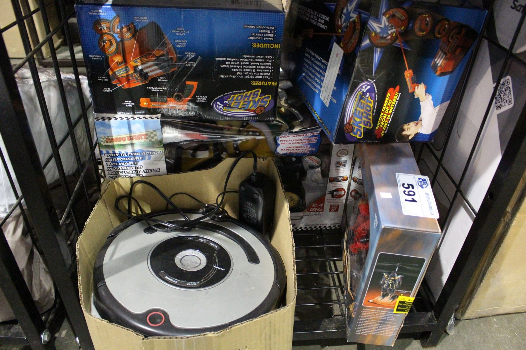 SHELF LOT OF TOYS, ROBOT VACUUM AND MORE