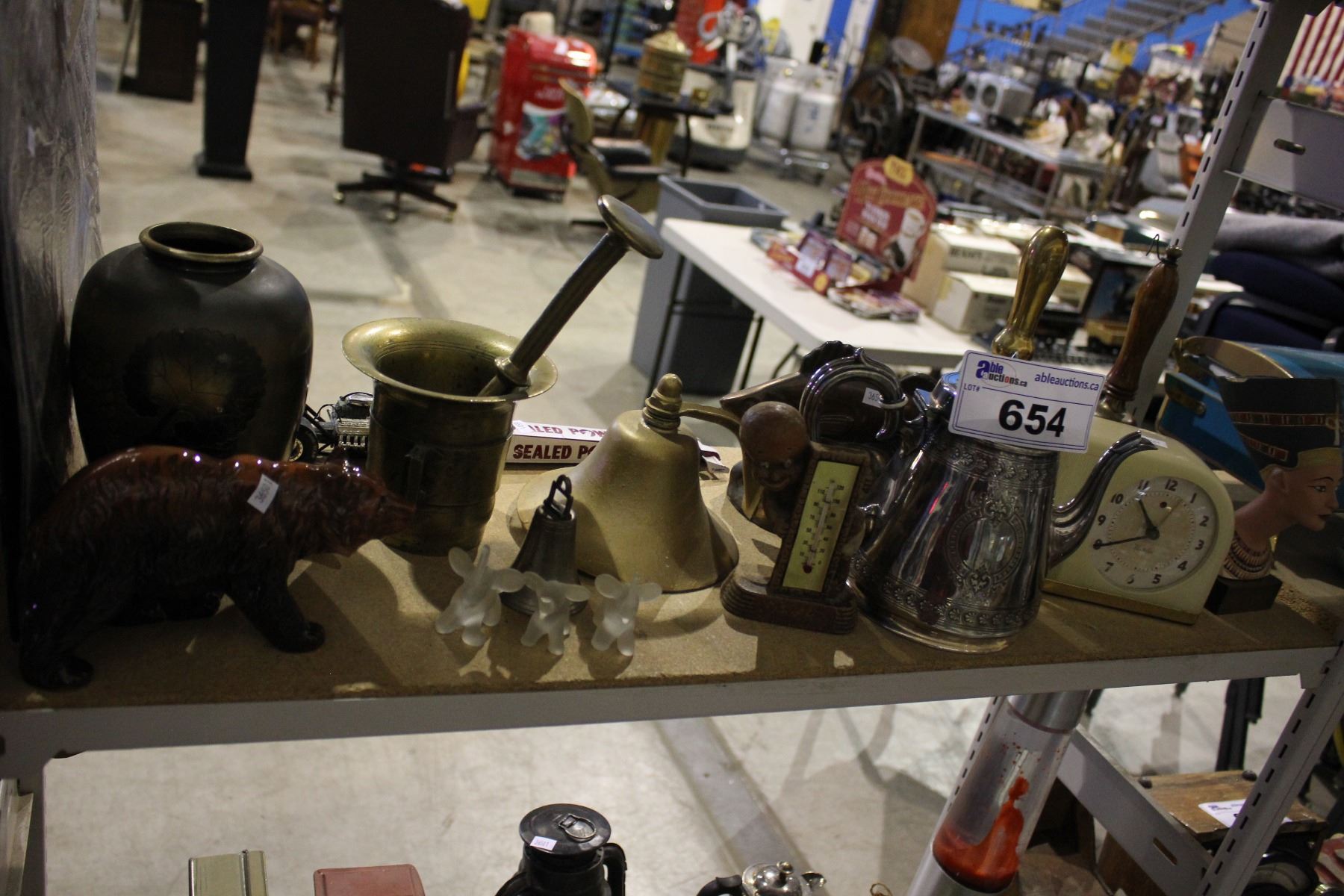 SHELF LOT OF VINTAGE COLLECTABLES INCLUDING THERMOMETER, KISS RECORD, CLOCK AND MORE