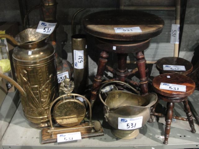 SHELF LOT OF VINTAGE COLLECTABLES; PIANO STOOLS, WASHBOARD, ARTILLERY SHELL CASES, BRASSWARES, ETC
