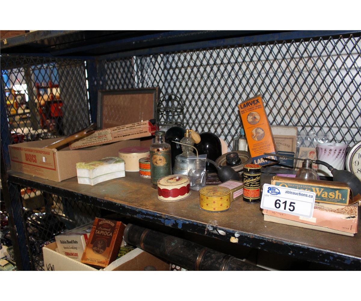 SHELF LOT OF VINTAGE COLLECTORS ITEMS; ALARM CLOCKS, PERFUME BOTTLES, ETC
