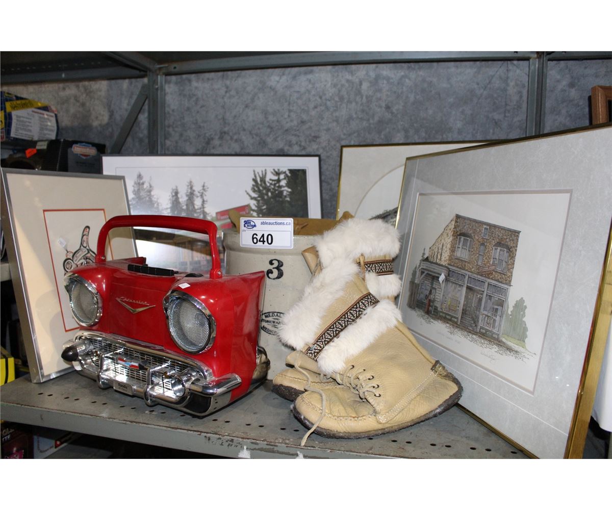 SHELF LOT OF VINTAGE FRAMED LOCAL ABBOTSFORD GENERAL STORE, CHEVROLET NOSTALGIC RADIO, MADELTA CROCK POT, NATIVE PRINT AND INDIAN MOCCASINS