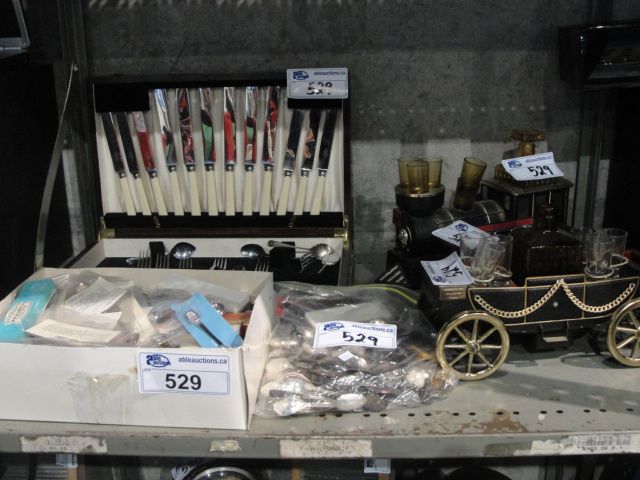 SHELF LOT OF VINTAGE ITEMS; LARGE COLLECTION OF COLLECTORS SPOONS, SILVERWARE SET, TRAIN DECANTER SET, ETC