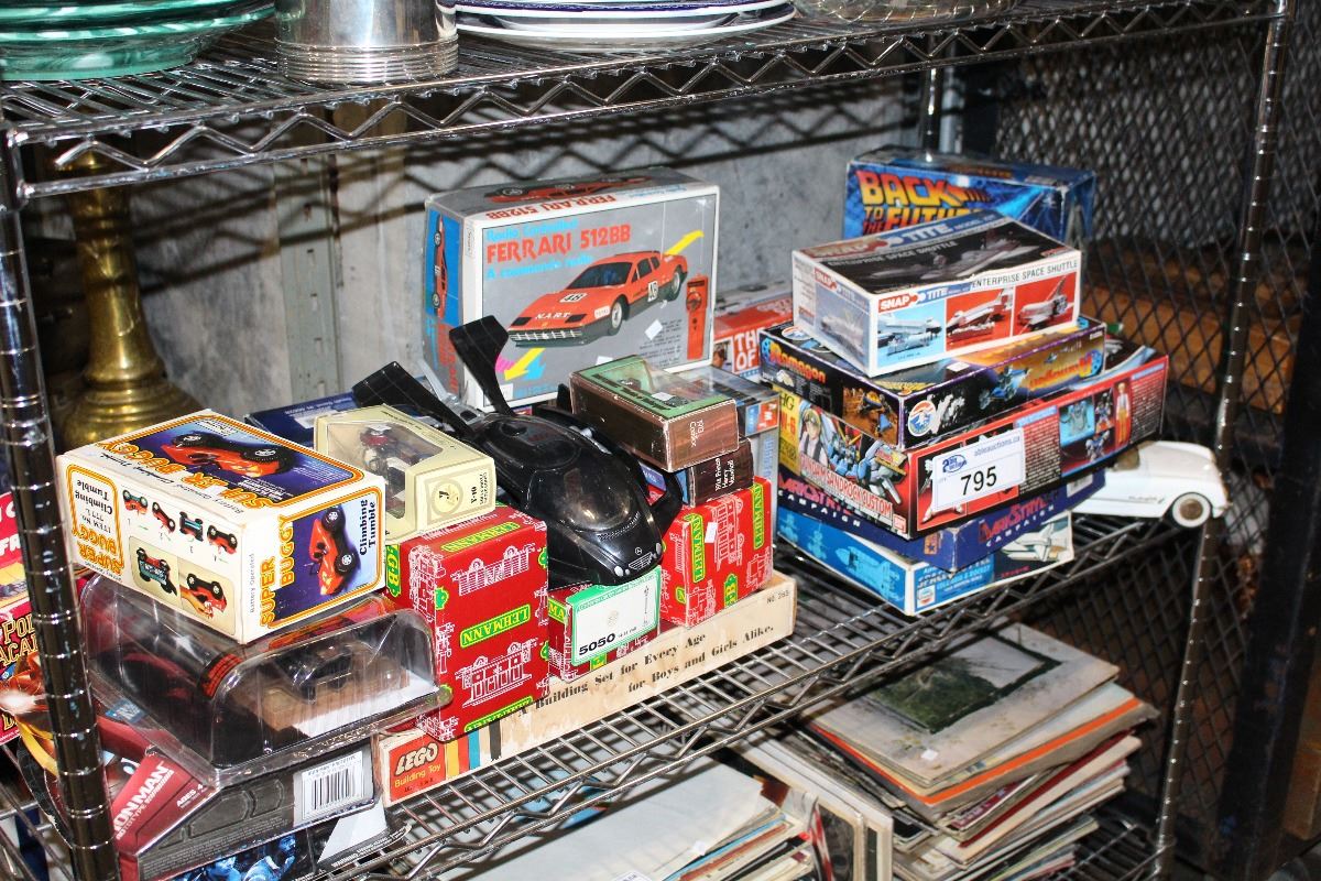 SHELF LOT OF VINTAGE MODELS, TOYS, COLLECTABLES, ETC