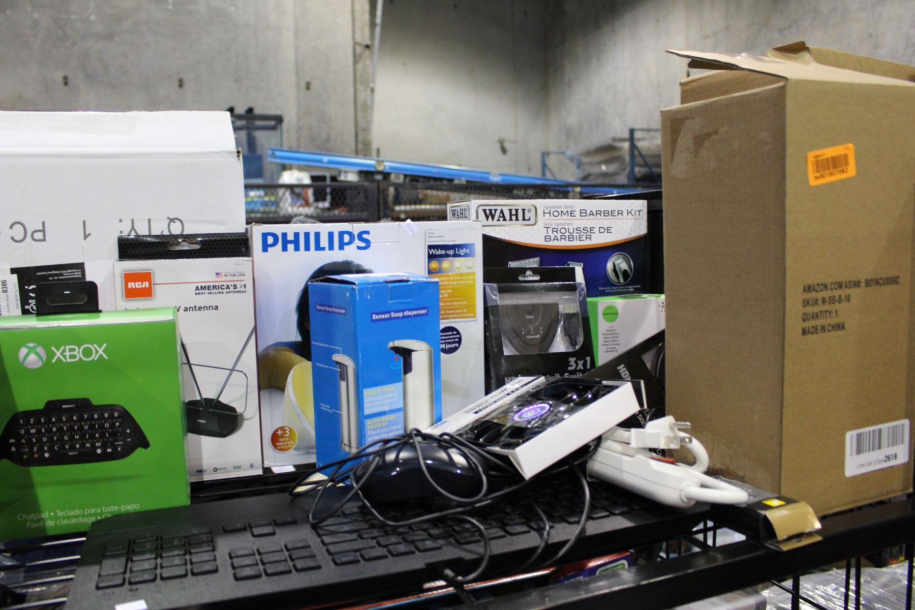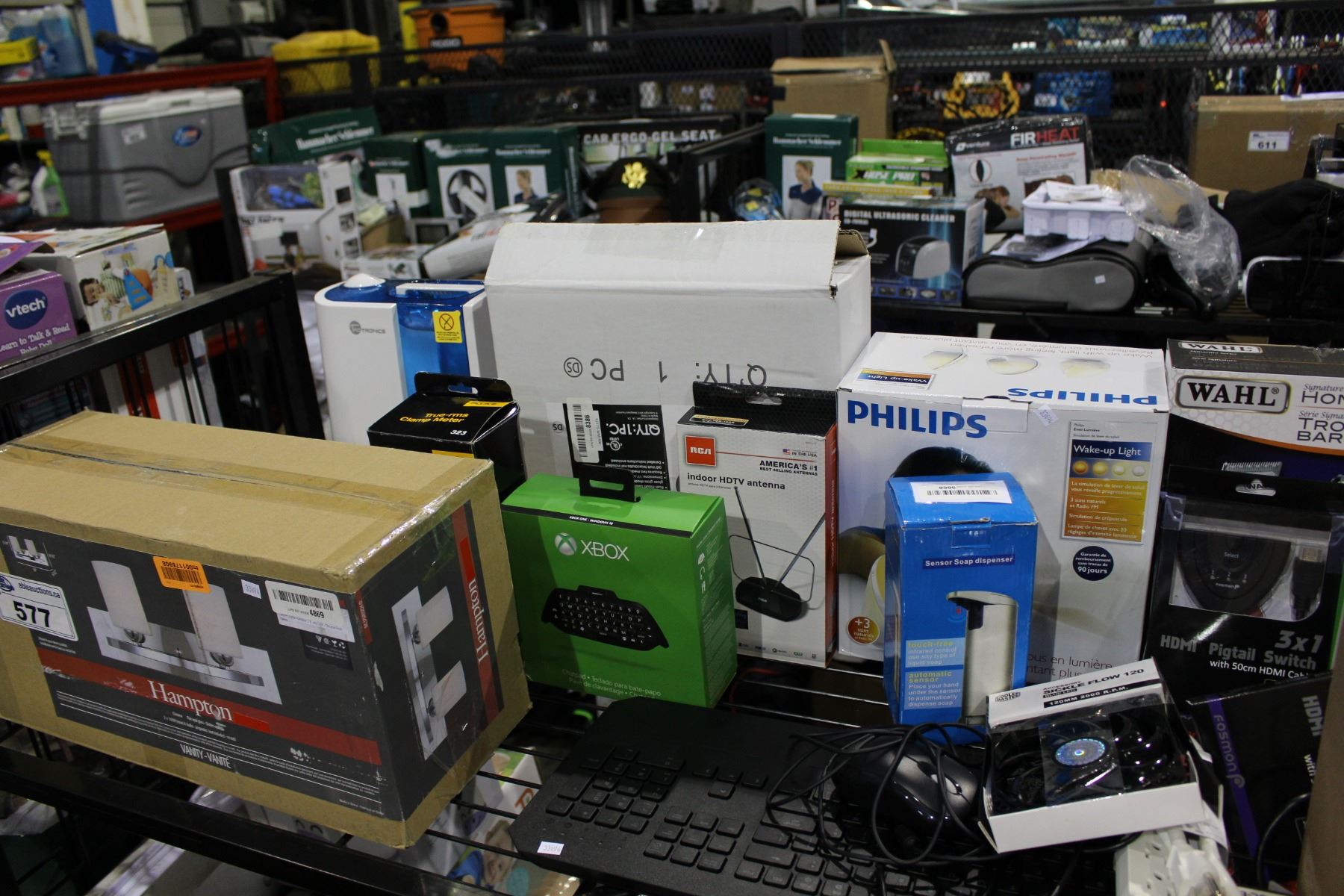SHELF LOT OF WALL LIGHT, HUMIDIFIER, KEYBOARDS AND MORE