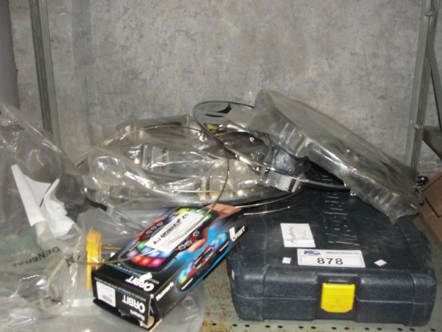 SHELF LOT OF WHEEL COVERS, ASSORTED TOOLS ETC