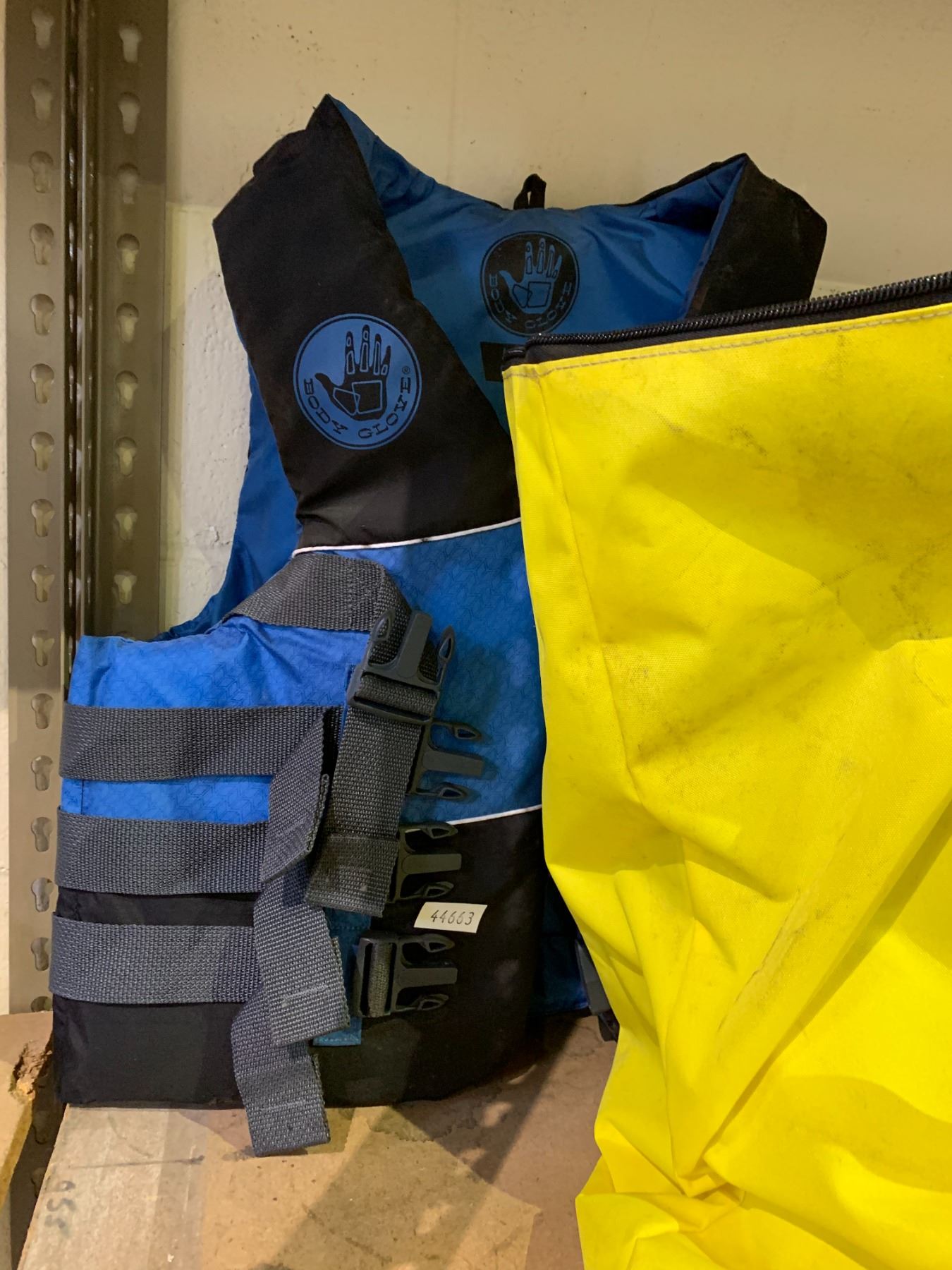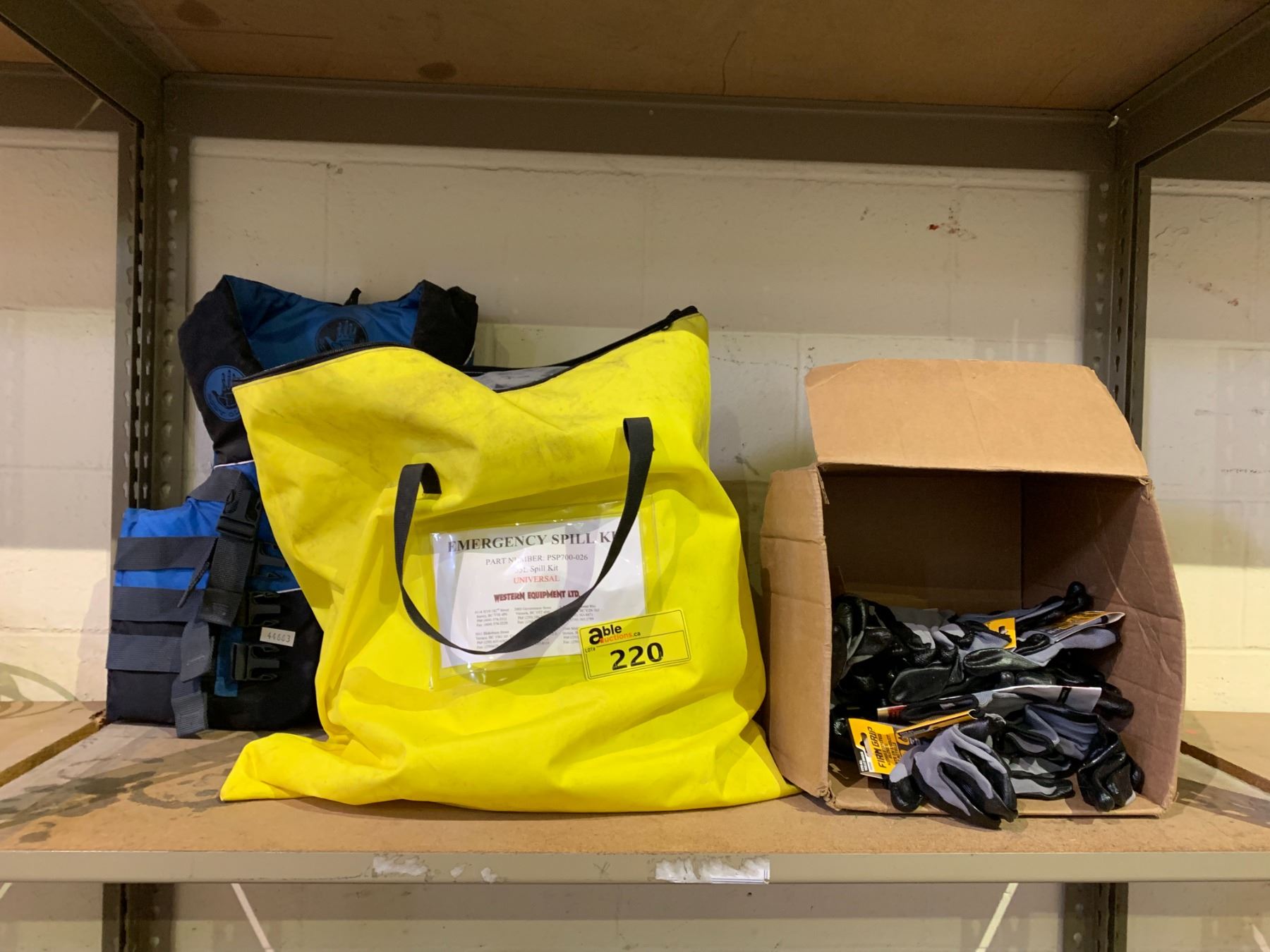 SHELF LOT OF; WORK GLOVES, EMERGENCY SPILL KIT AND LIFE JACKET
