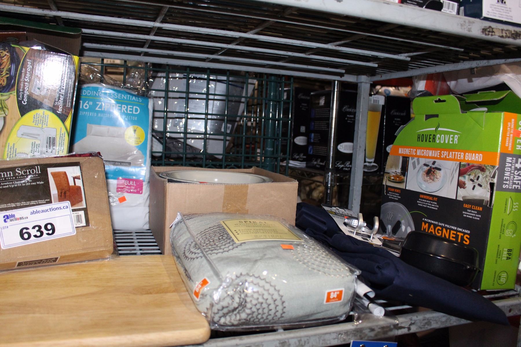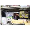 SHELF LOT - STOVE TOP GLASS PERCOLATOR, PASTA MAKER, MISC DISHES, KITCHEN AND BATHROOM GOODS