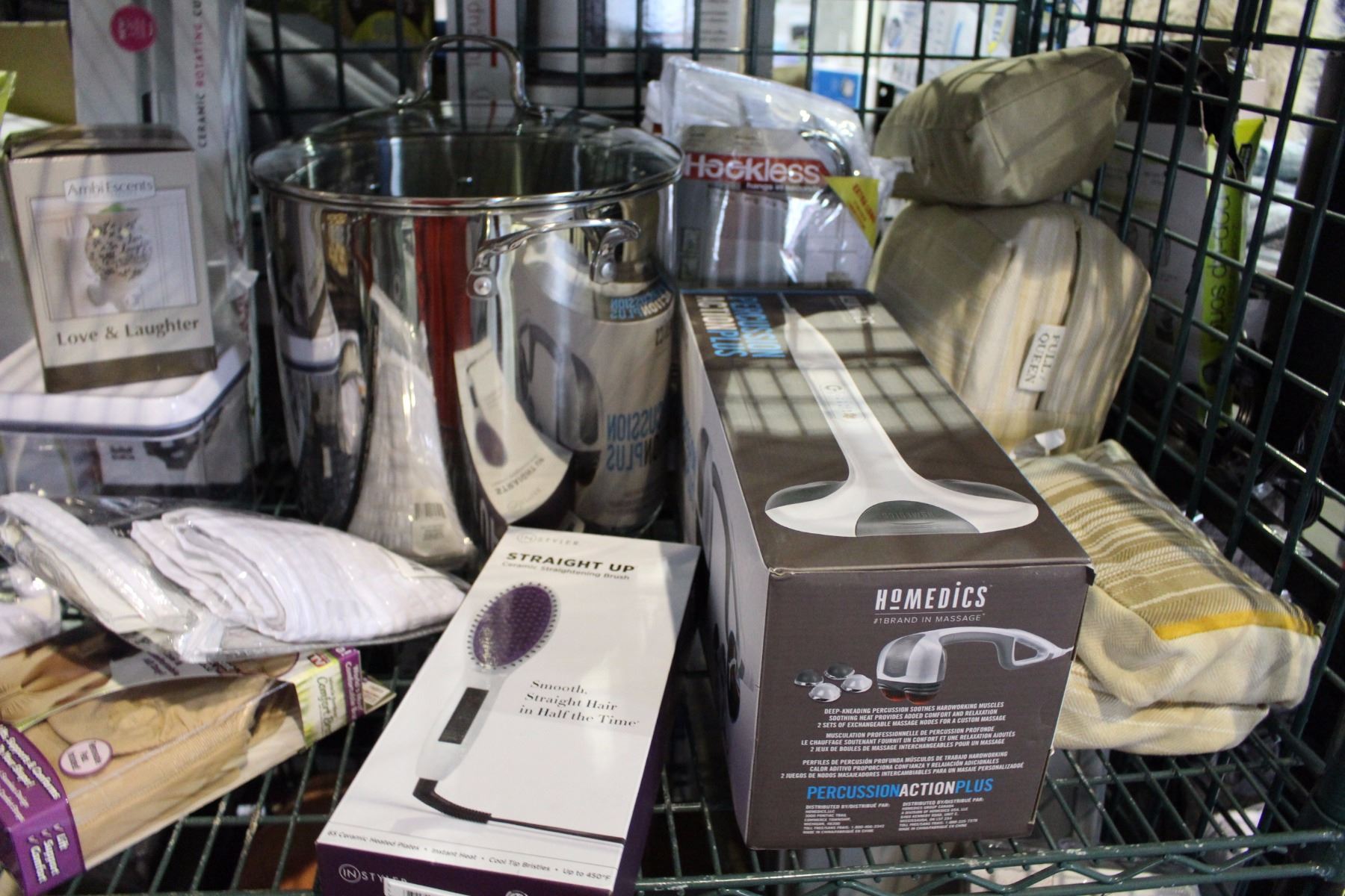 SHELF LOT - TABLETOP SEWING MACHINE, MISC TOWELS AND CURTAINS AND A 20L STOCK POT.
