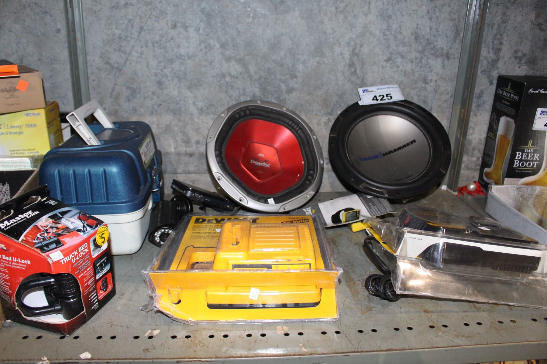 SHELF LOT WITH 2 SUBWOOFERS, 2 DEWALT CHARGERS AND MORE