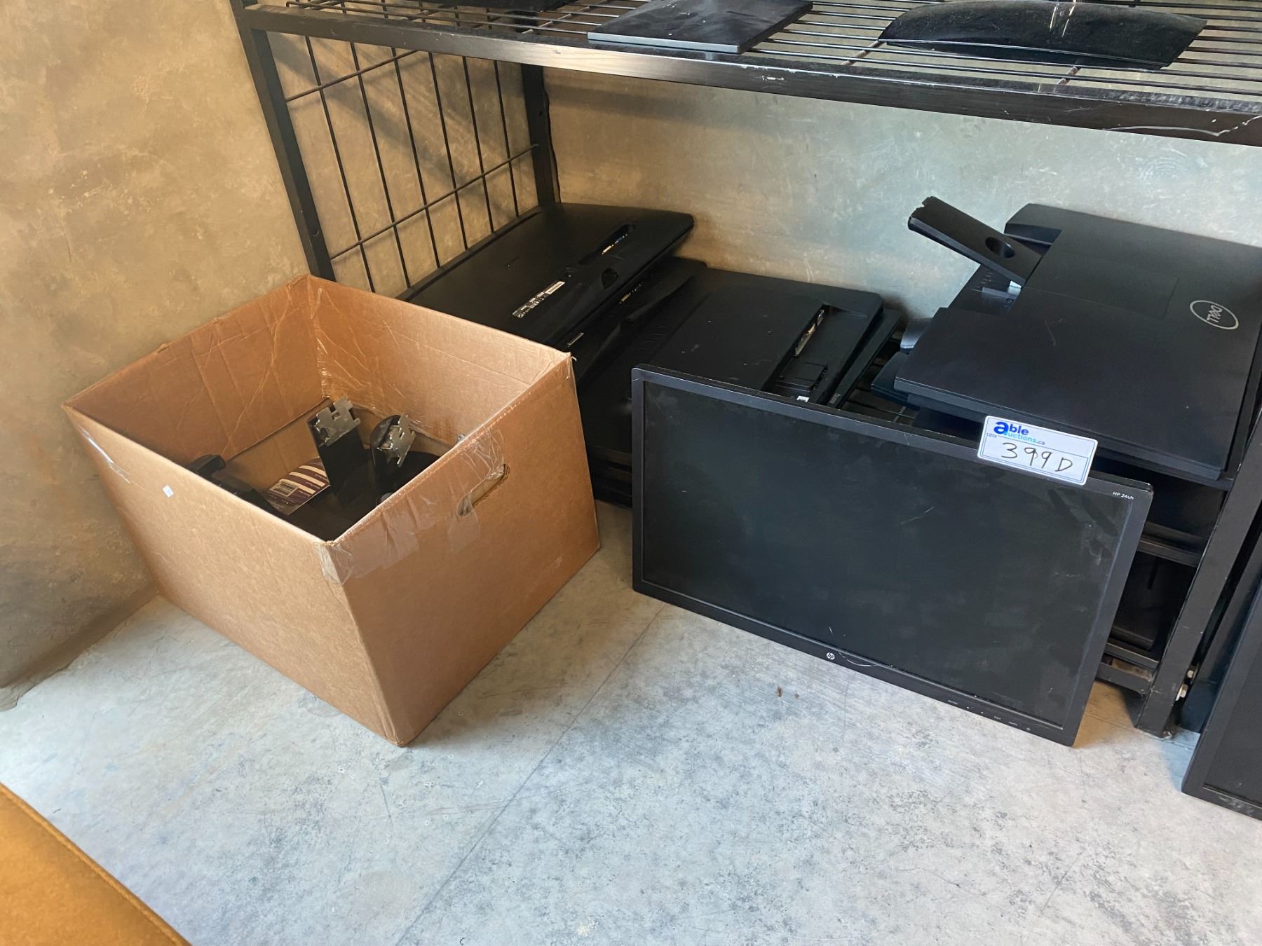 SHELF OF 13 ASSORTED 24" LCD MONITORS AND BOX OF ASSORTED MONITOR STANDS - NO POWER CORDS