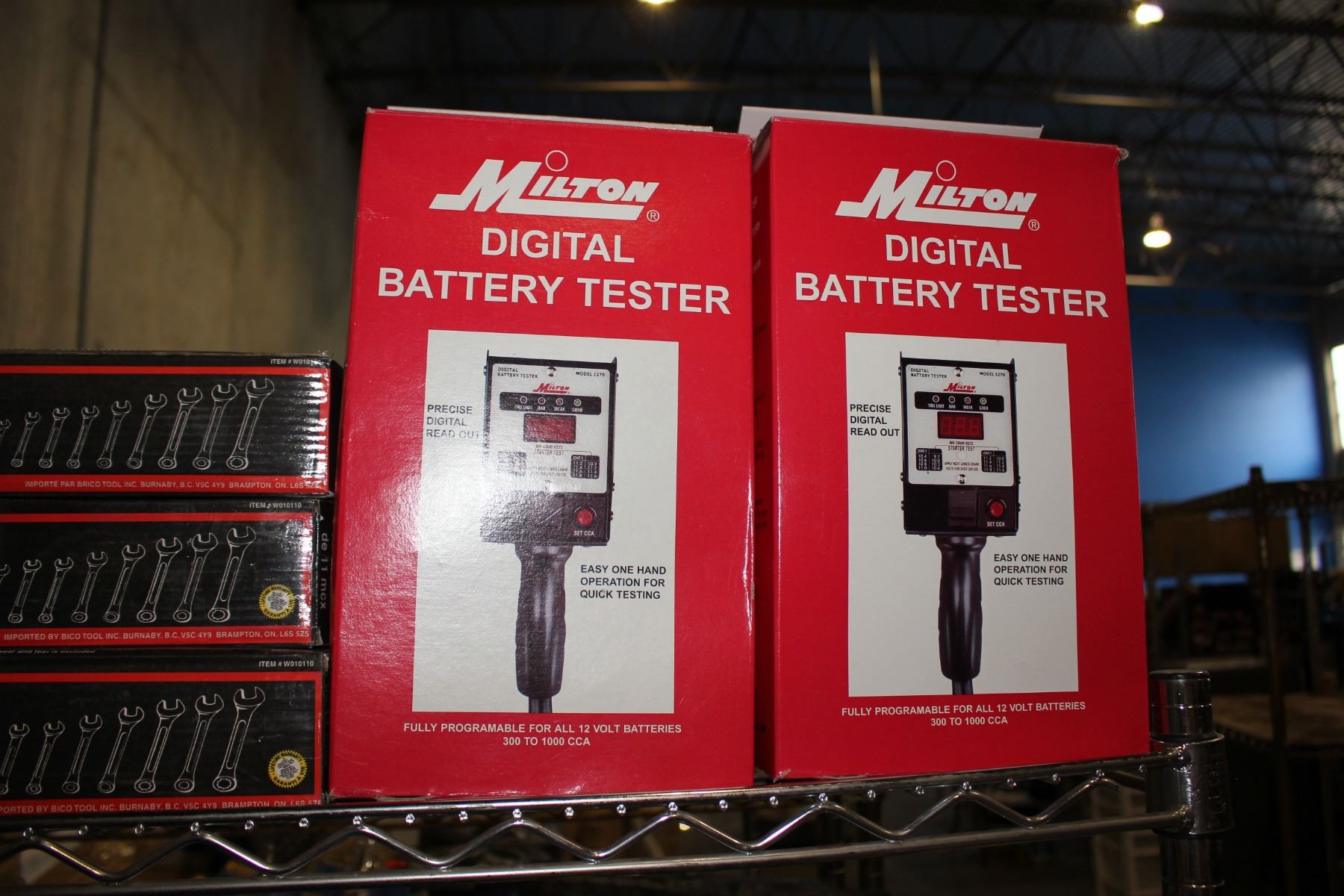 SHELF OF 3 MILTON DIGITAL BATTERY TESTERS AND ASSORTED WRENCH SETS