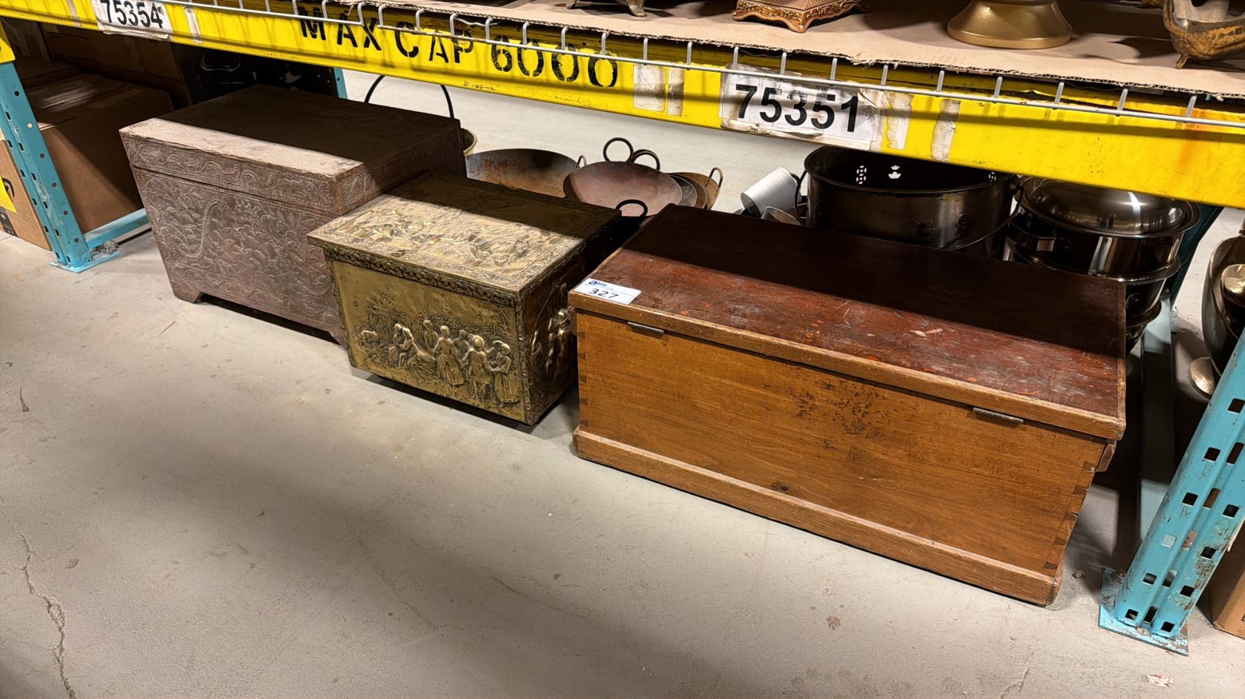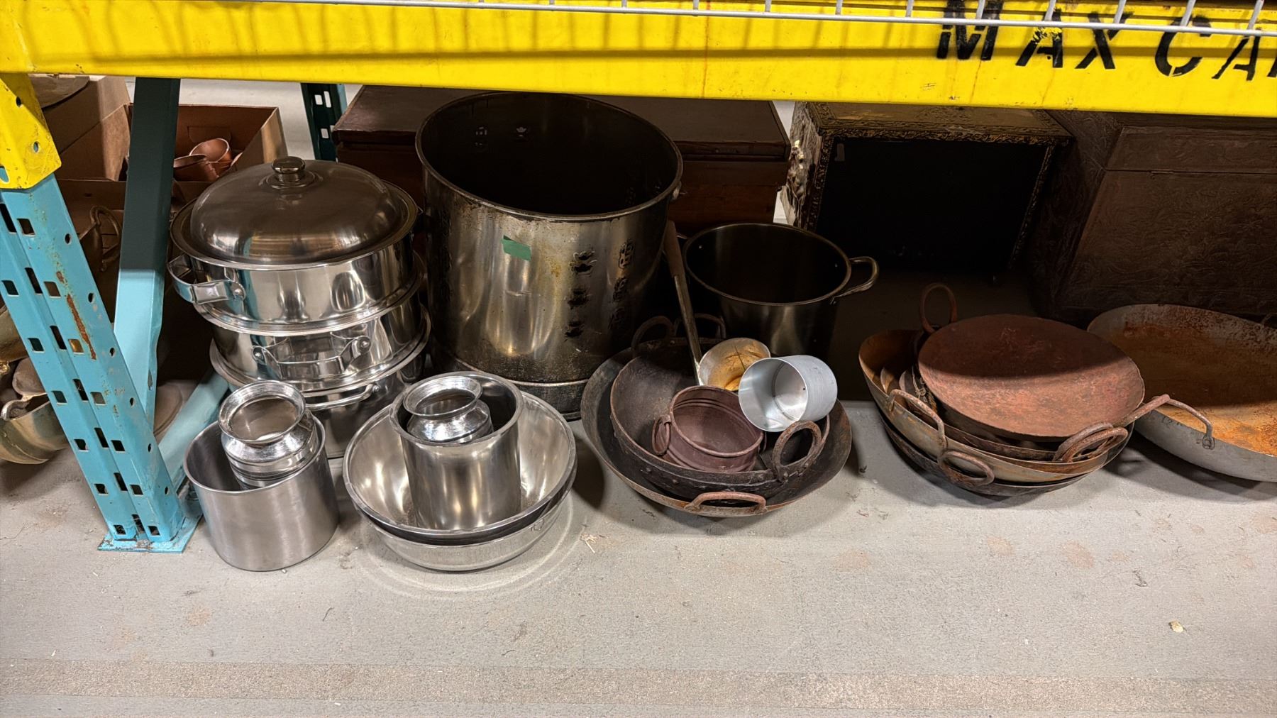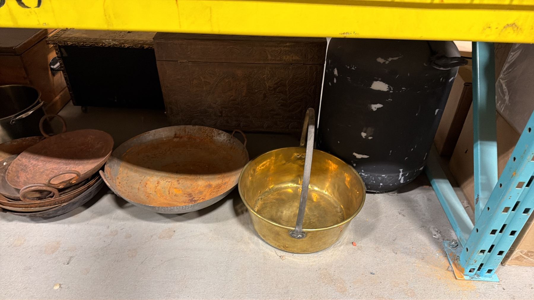 SHELF OF 3 VINTAGE STORAGE TRUNKS & ASSORTED COOKING POTS/PANS