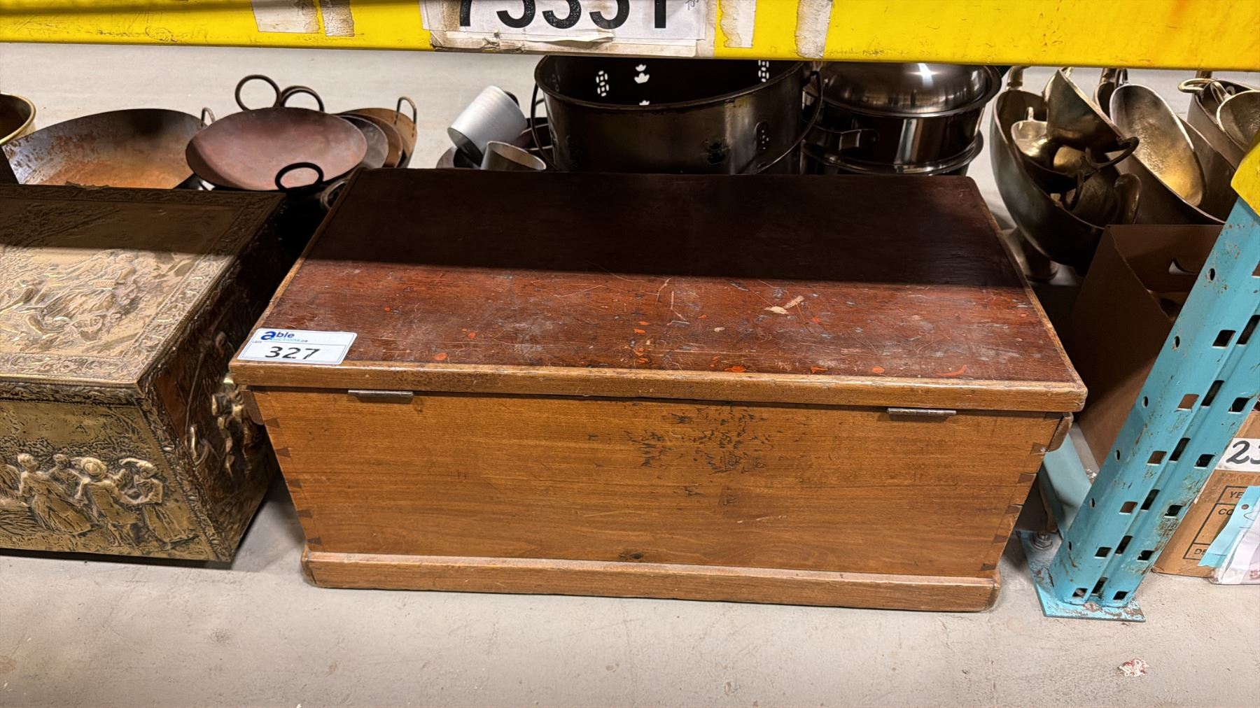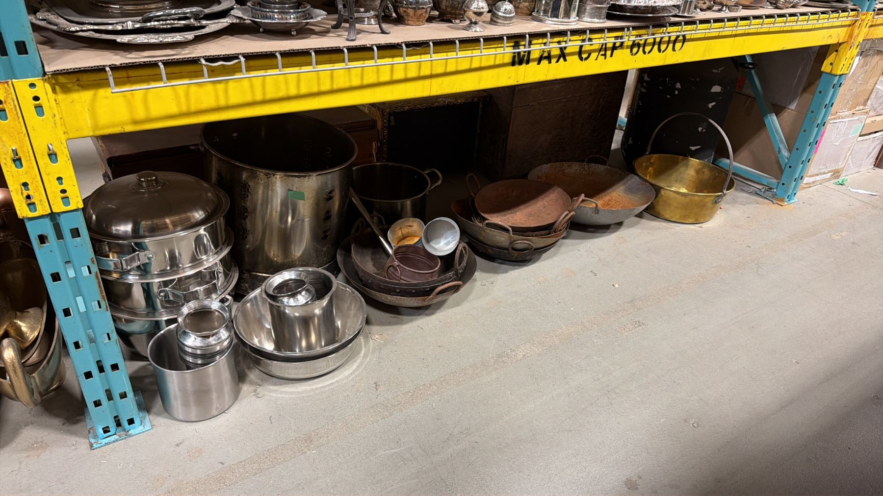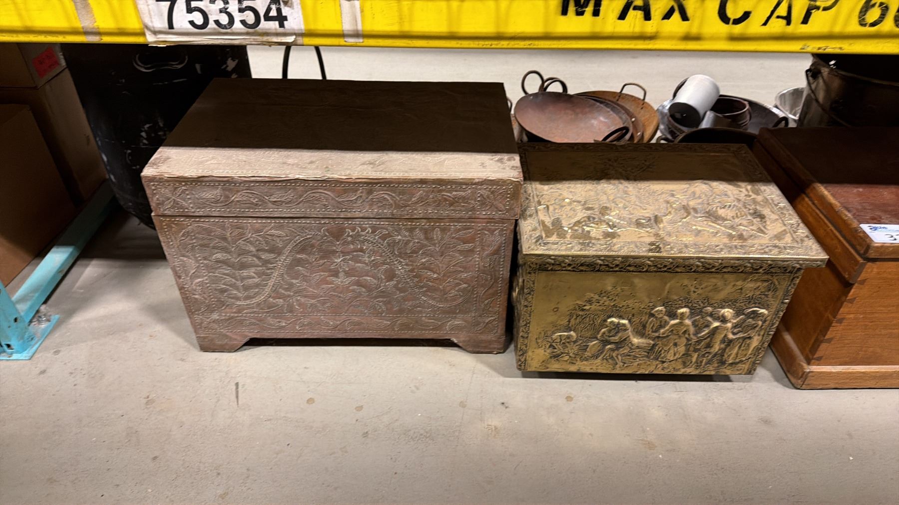 SHELF OF 3 VINTAGE STORAGE TRUNKS & ASSORTED COOKING POTS/PANS