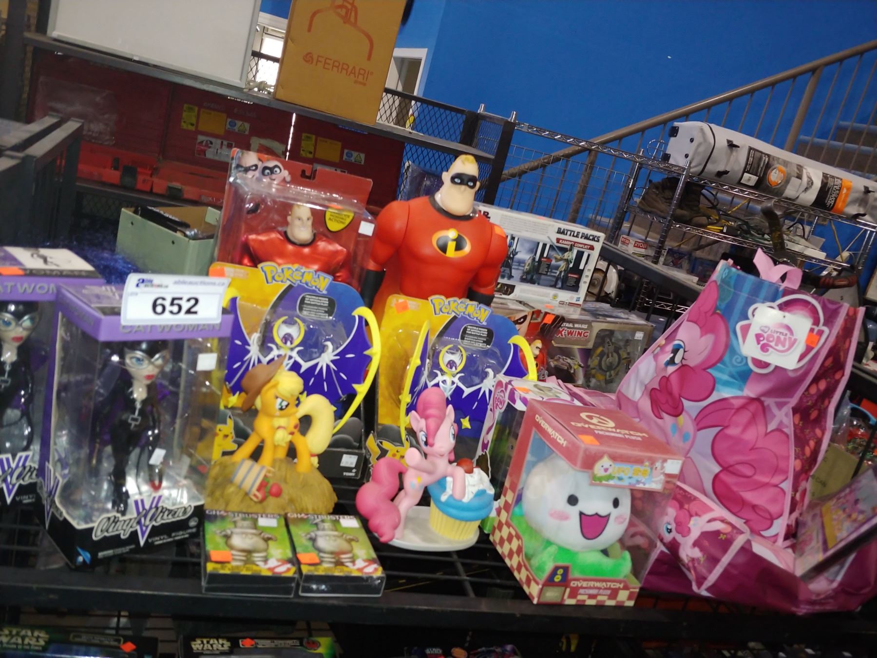SHELF OF ACTION FIGURES AND TOYS INCLUDING MY LITTLE PONY, THE INCREDIBLES AND MORE