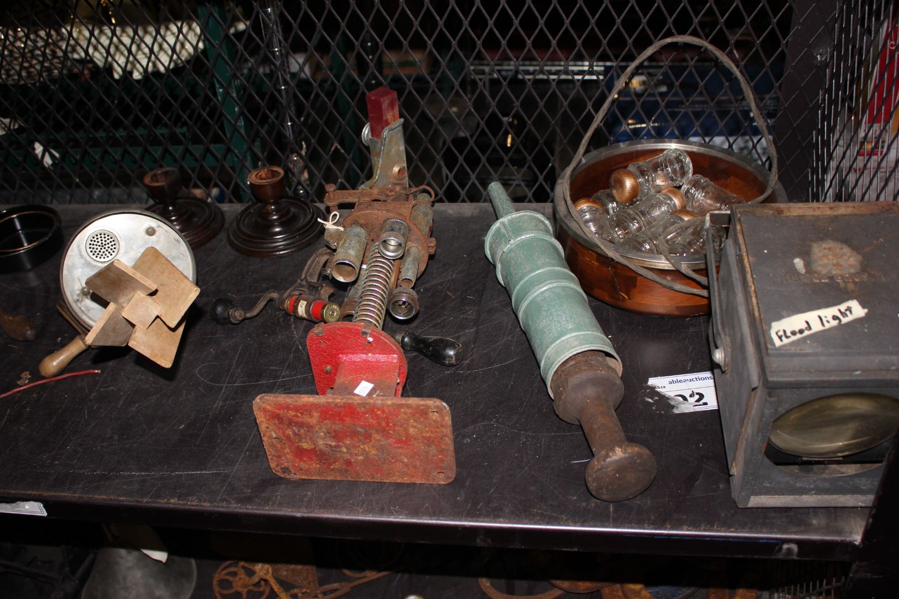 SHELF OF ANTIQUE COLLECTABLES INCLUDING KITCHEN TOOLS, FLOOD LIGHT, AND MORE