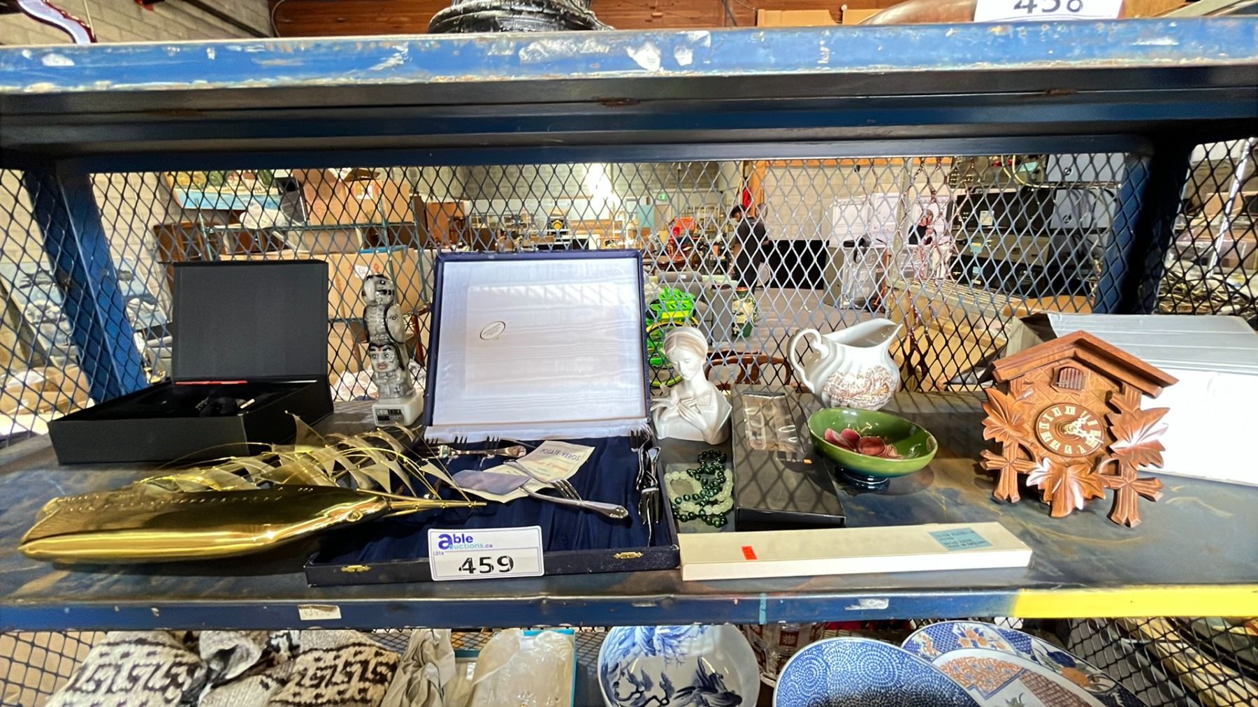 SHELF OF ANTIQUE DECOR, PITCHER, FORKS, SAILBOAT, WOODEN WALL CLOCK & MORE