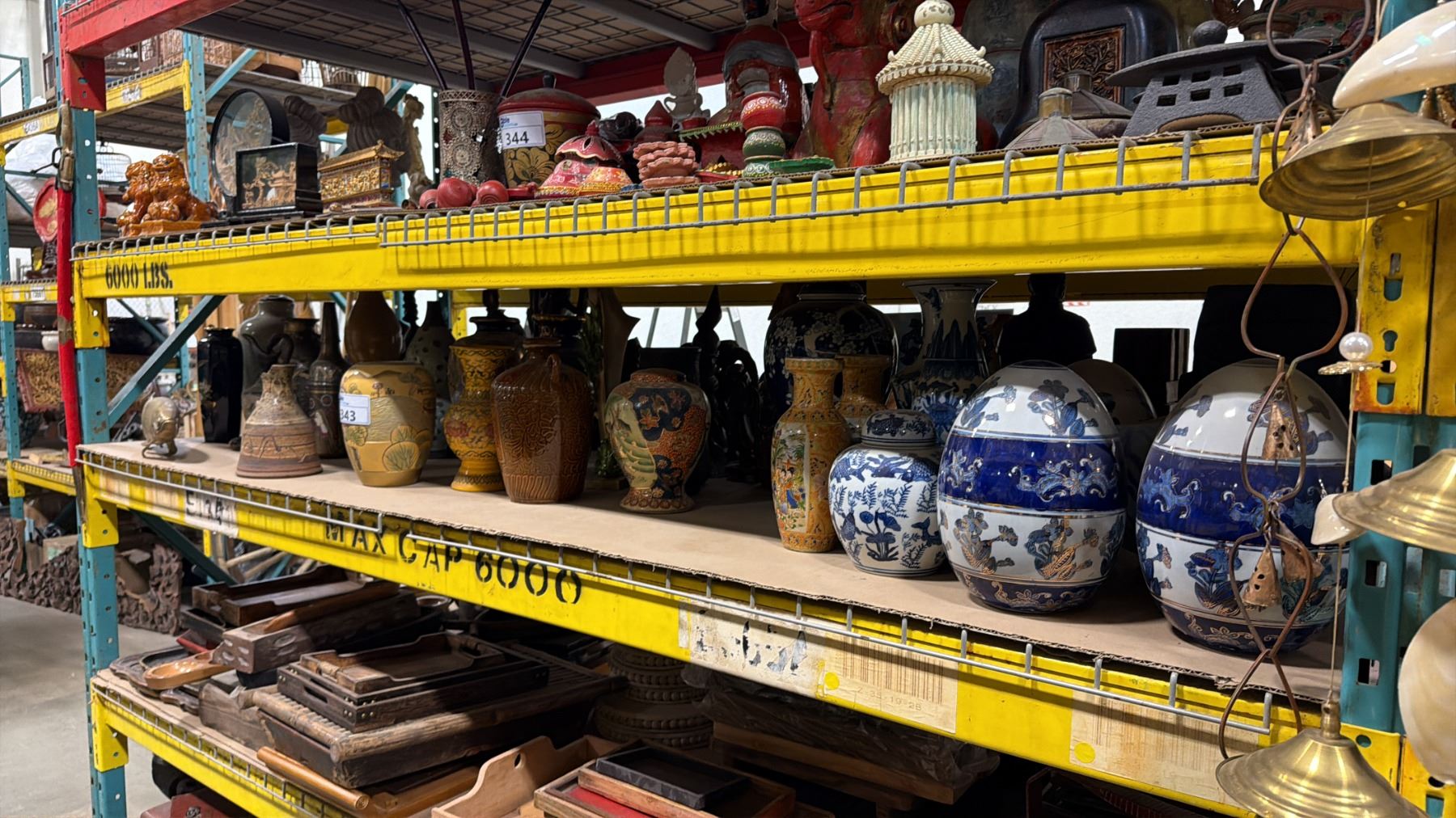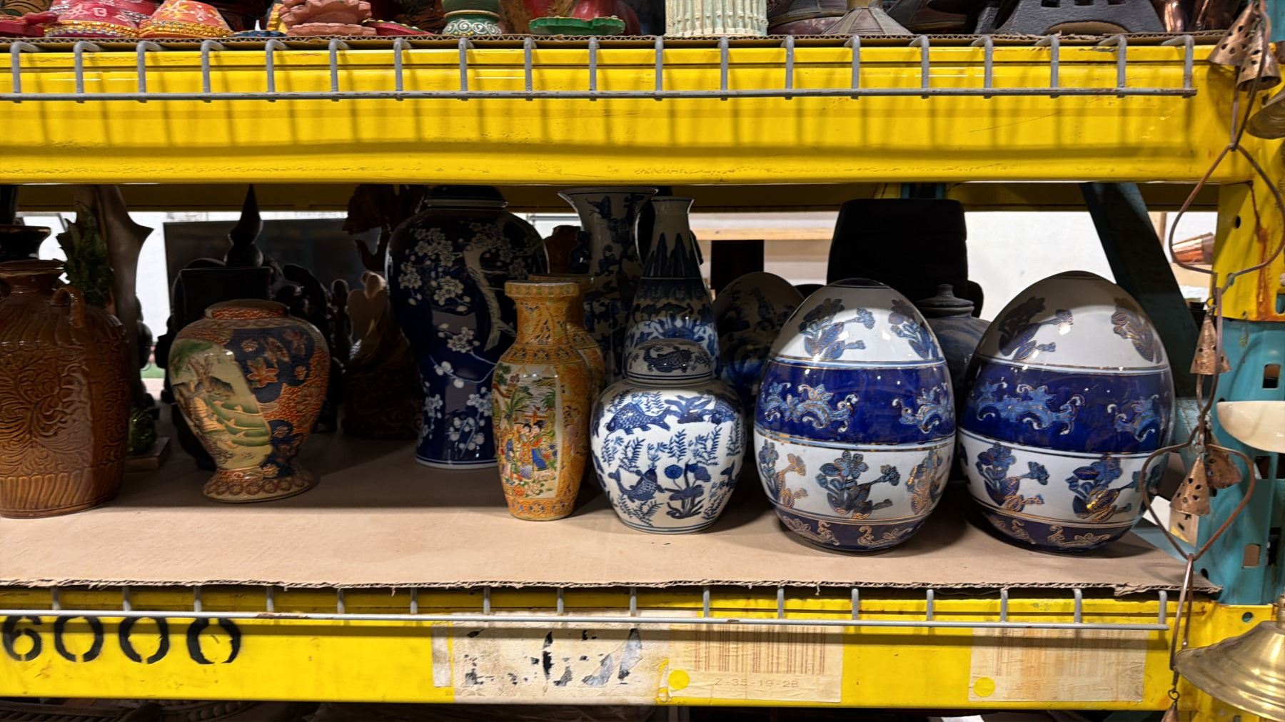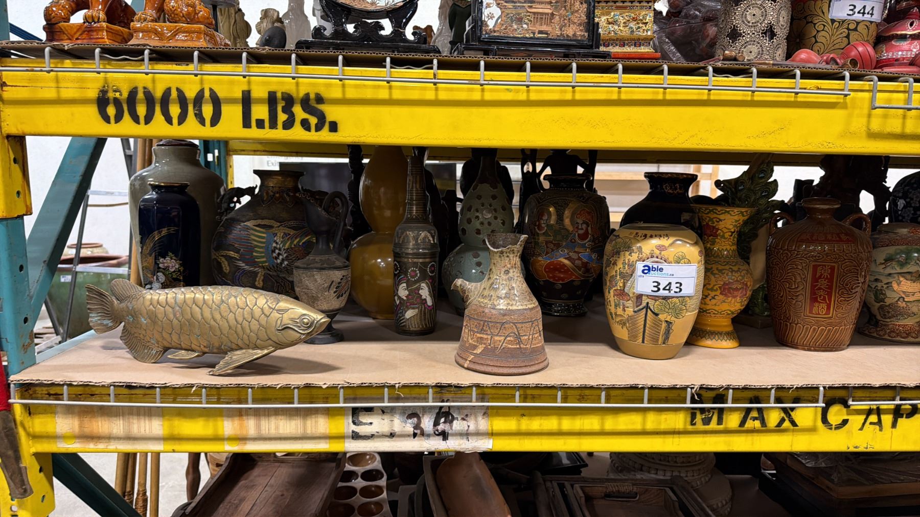 SHELF OF ASIAN & AFRICAN MOTIF STATUES, GLASS VASES & OTHER DECOR ITEMS