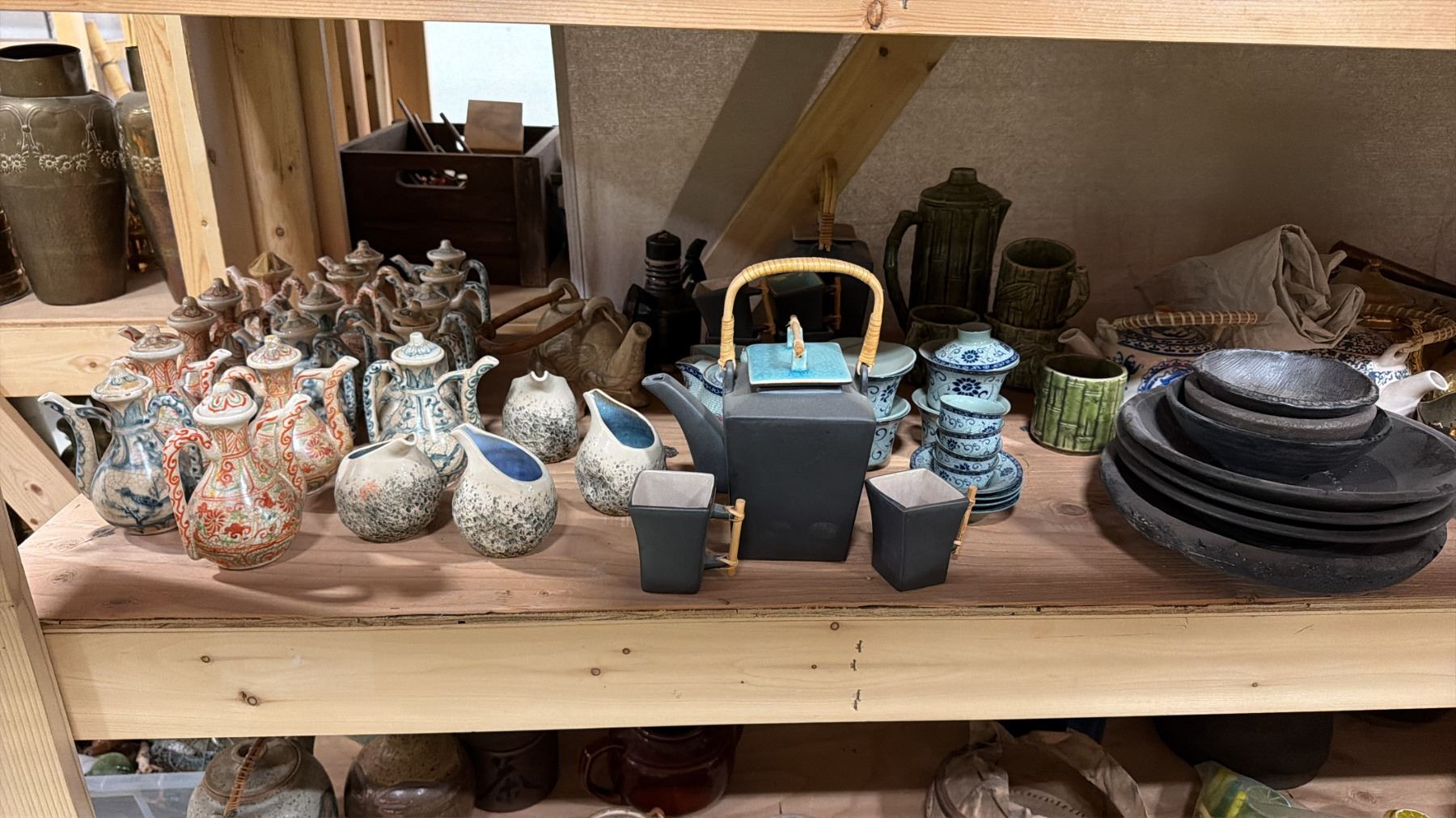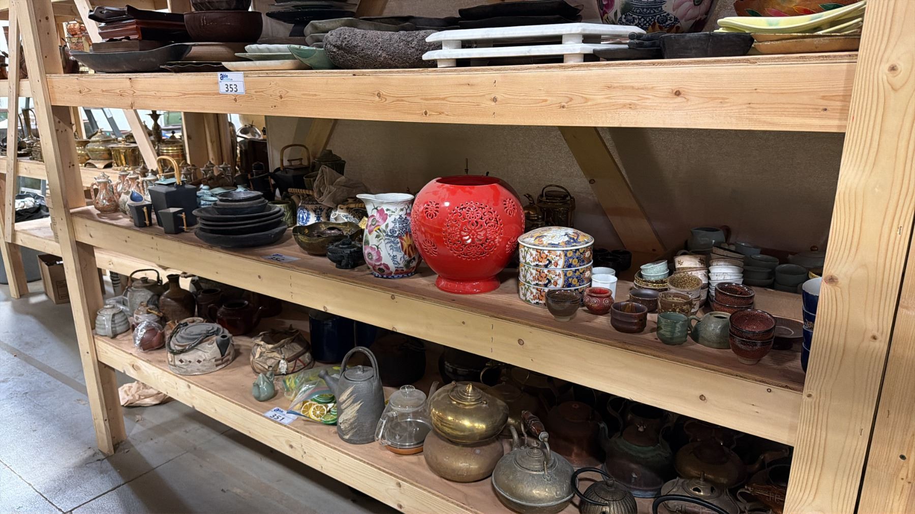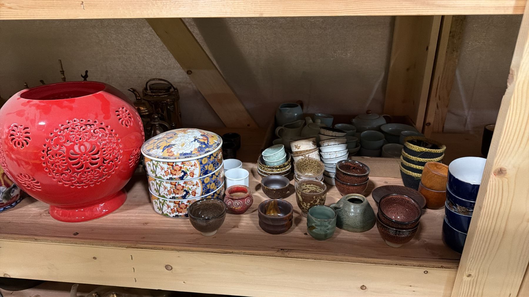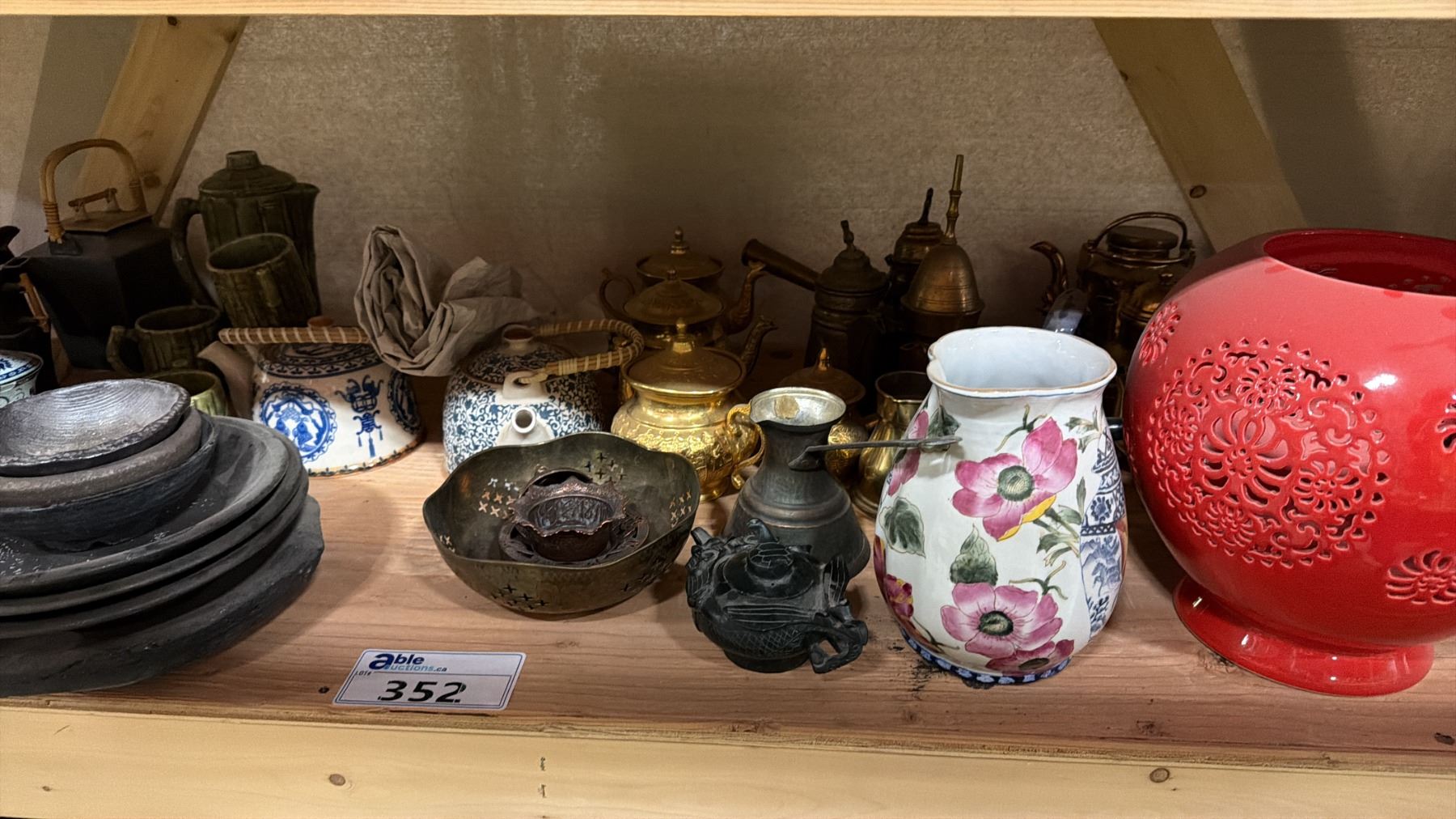 SHELF OF ASIAN MOTIF DISHES, TEA POTS & DECOR ITEMS