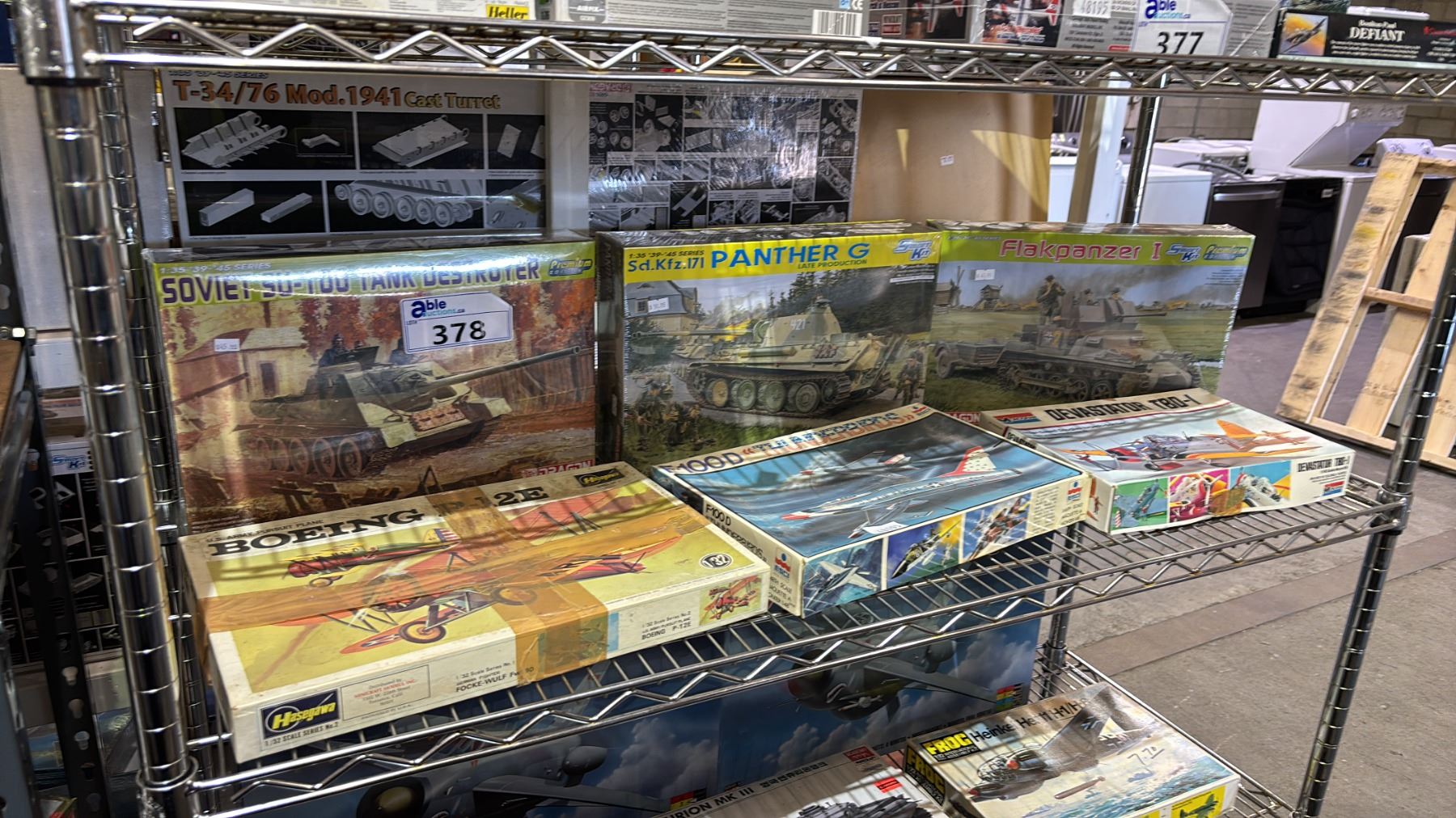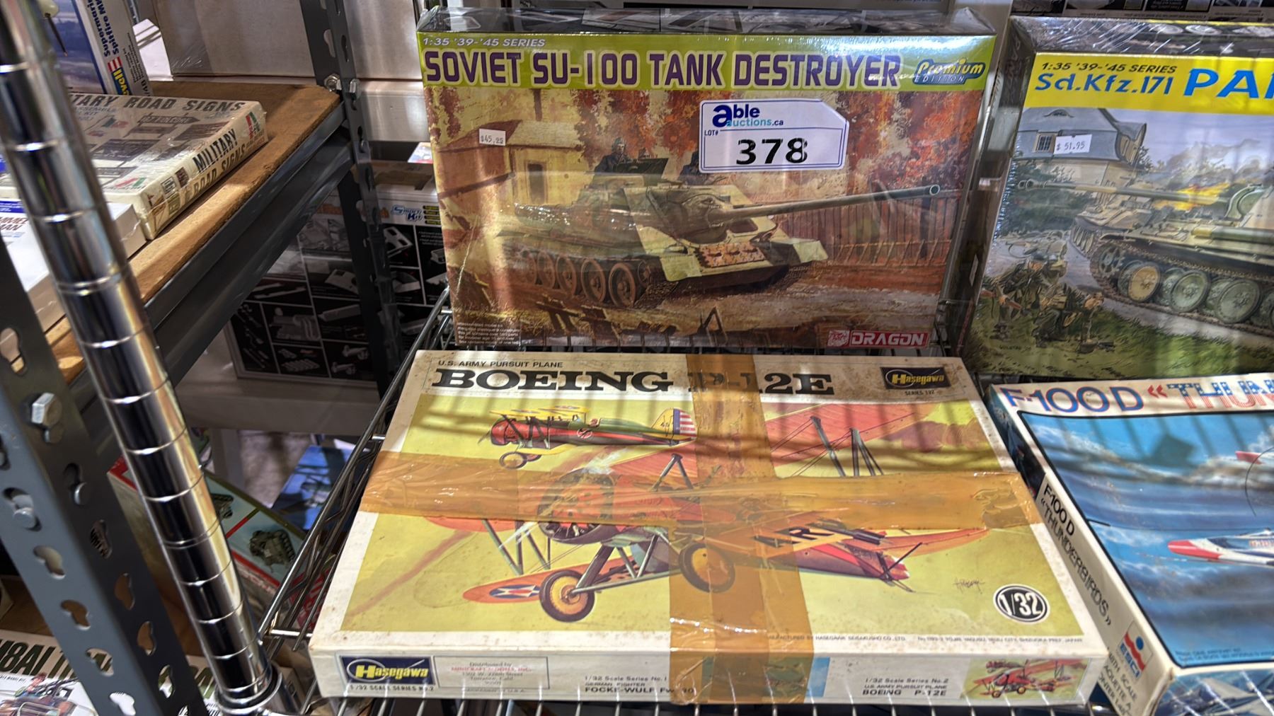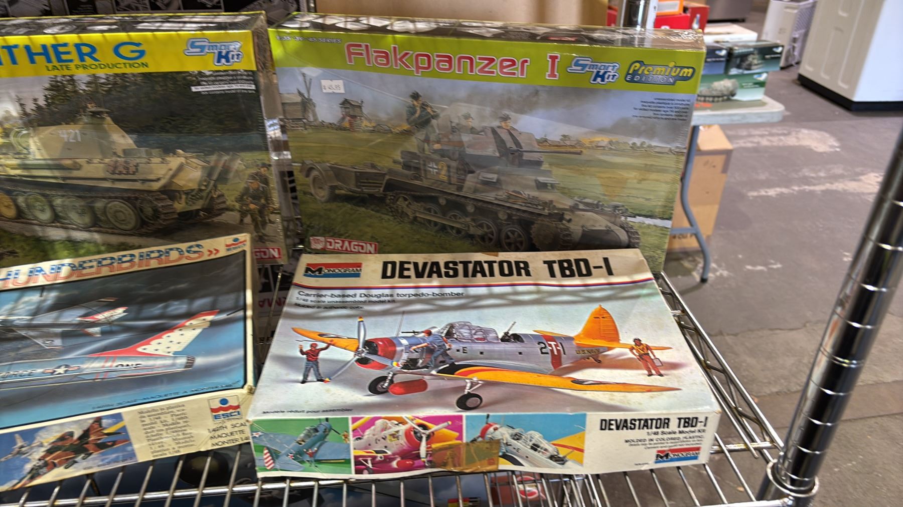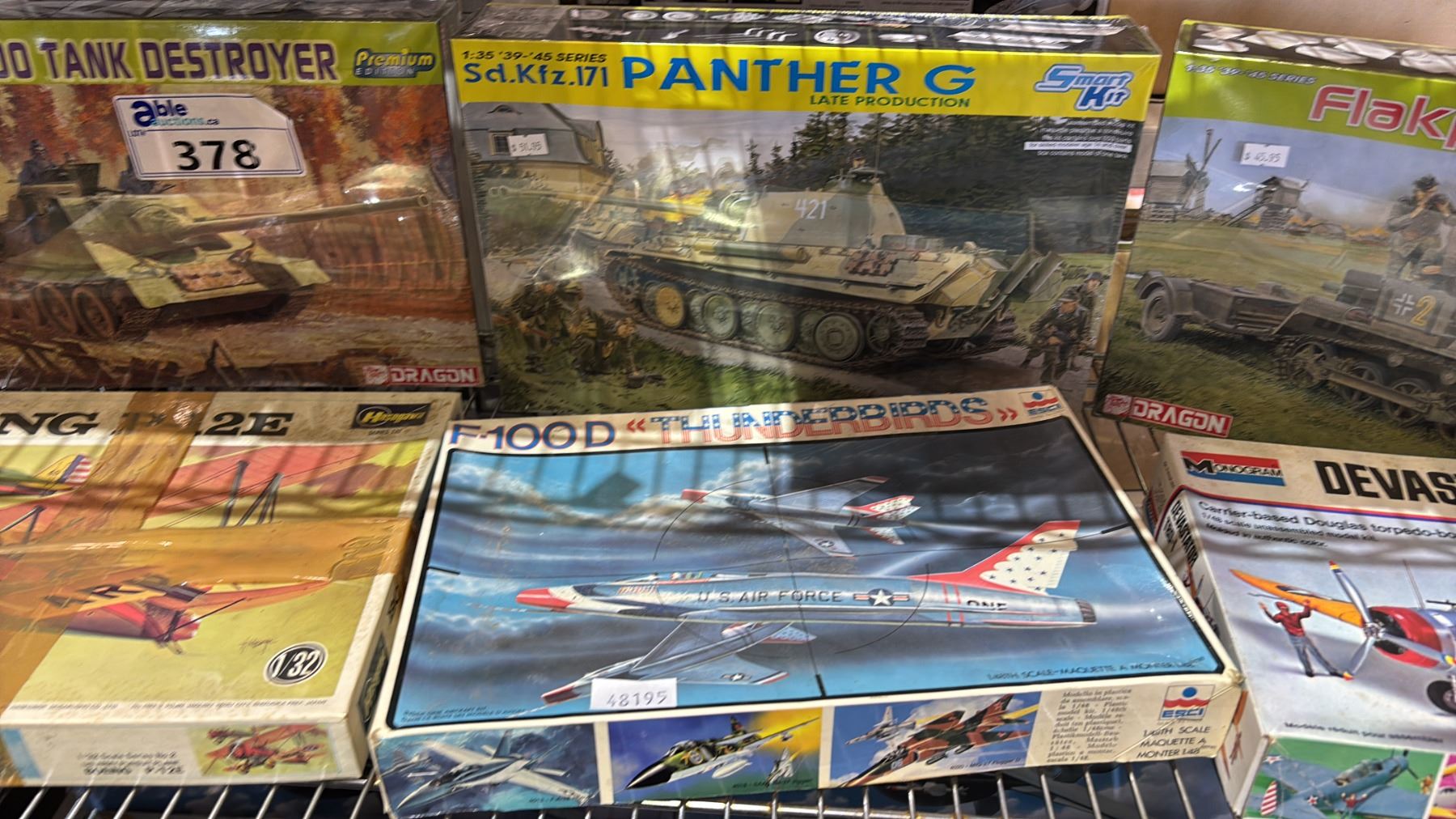 SHELF OF ASSORTED AIRPLANE & MILITARY VEHICLE MODEL KITS