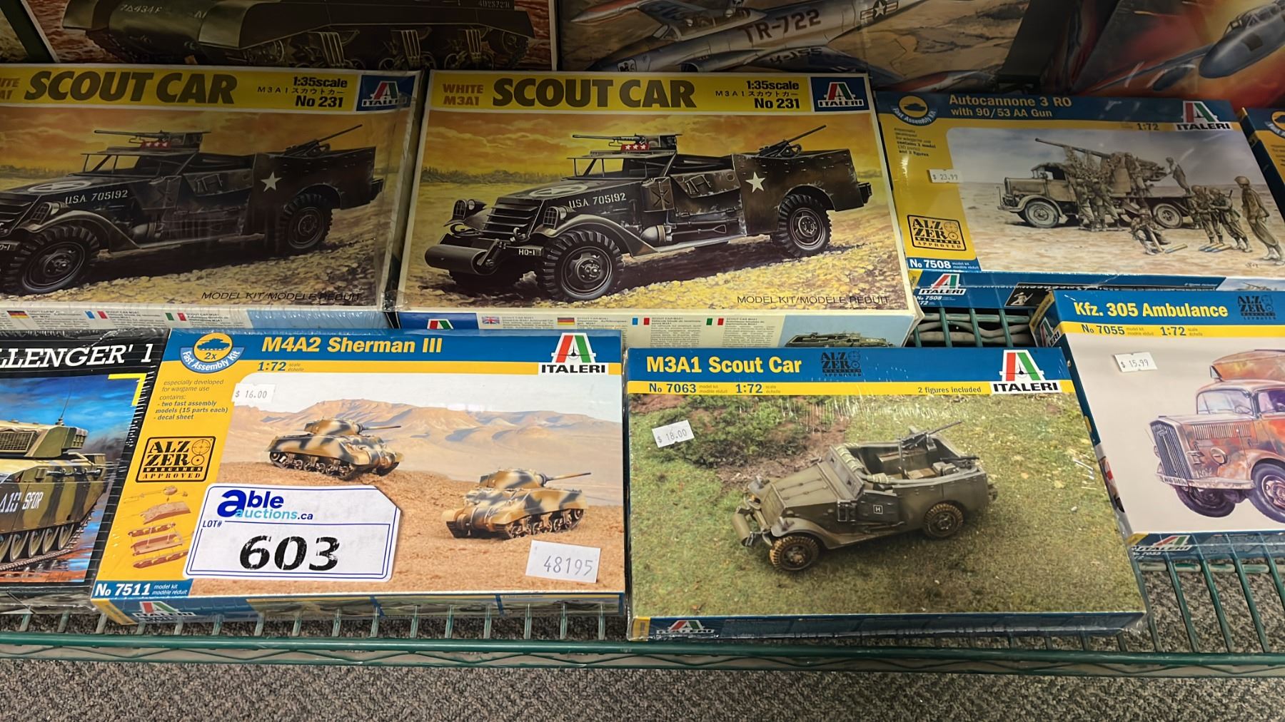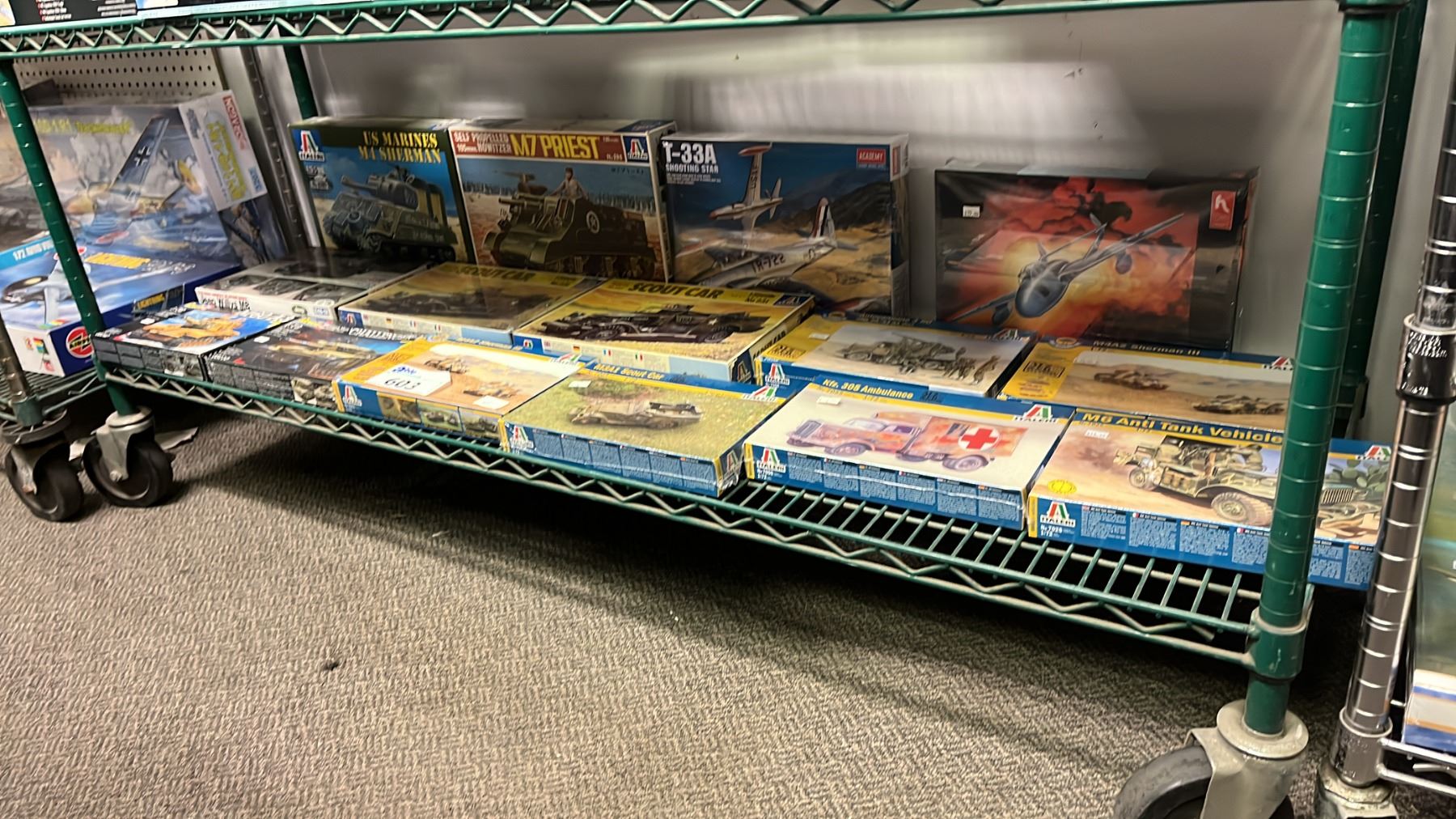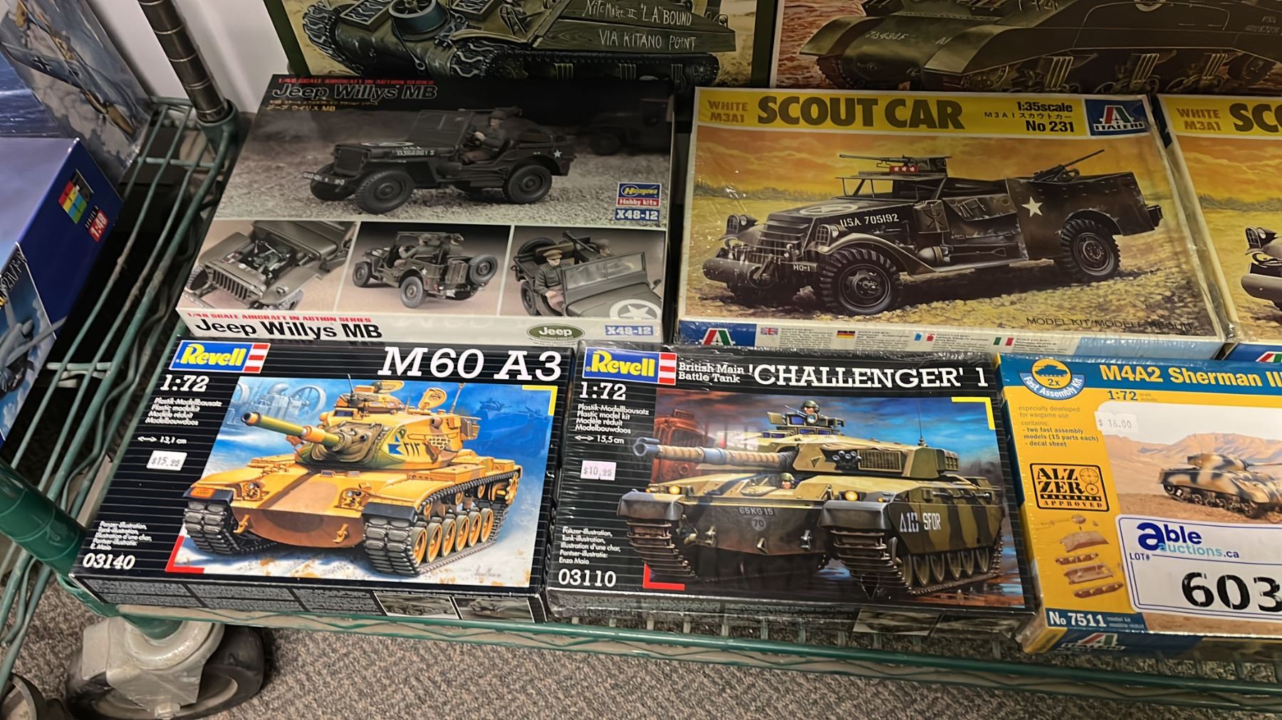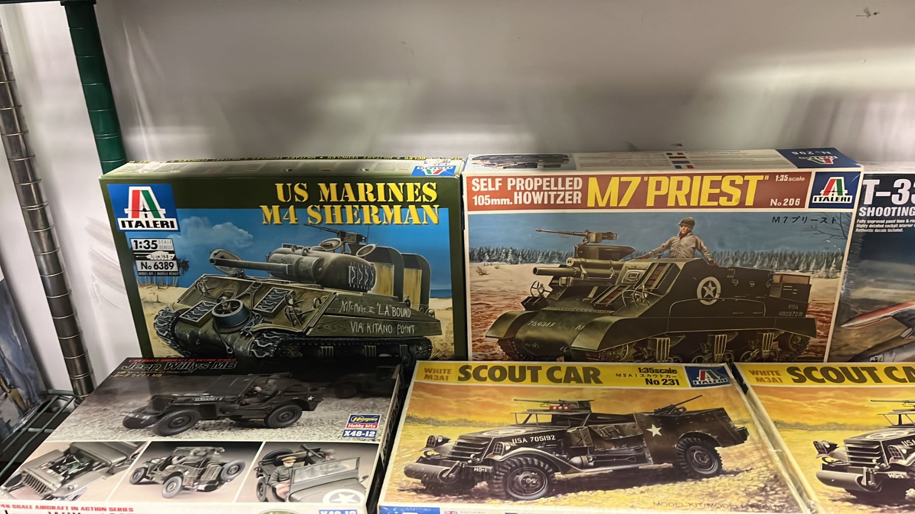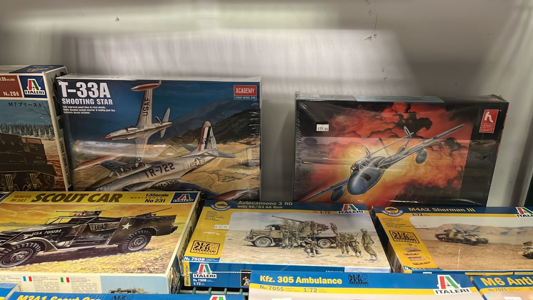 SHELF OF ASSORTED AIRPLANE & MILITARY VEHICLE MODEL KITS