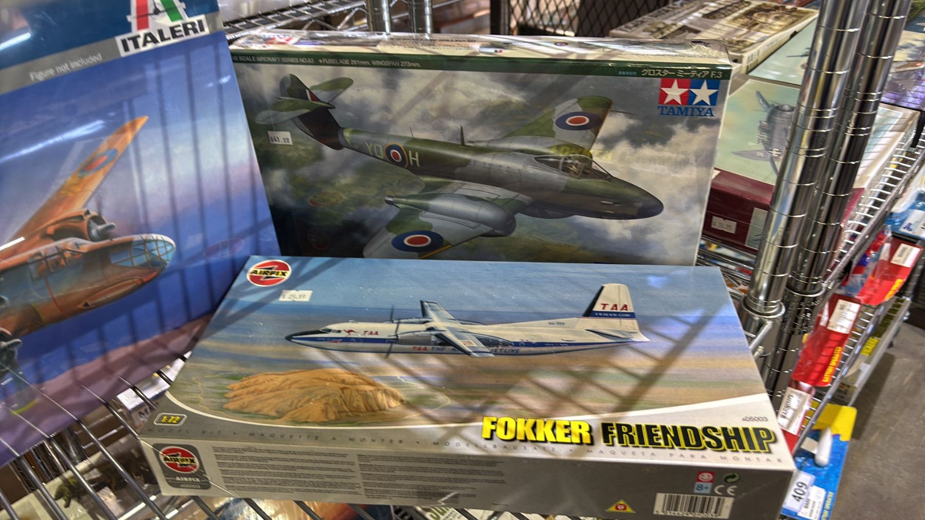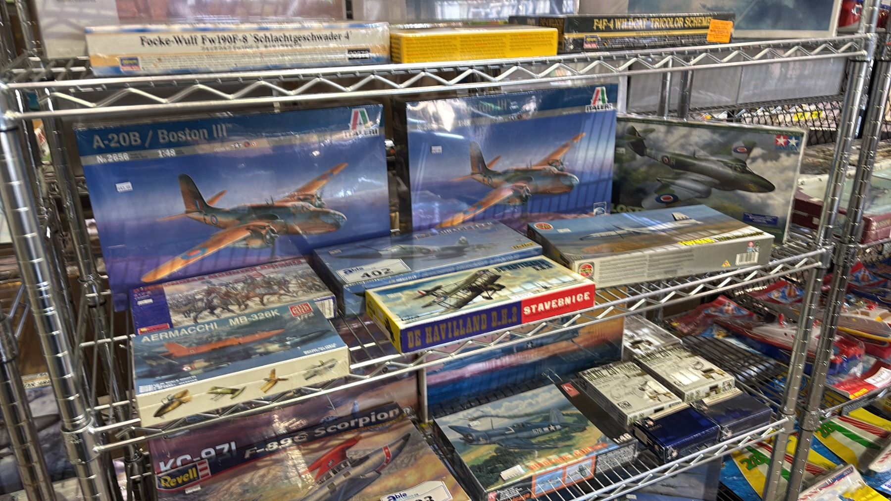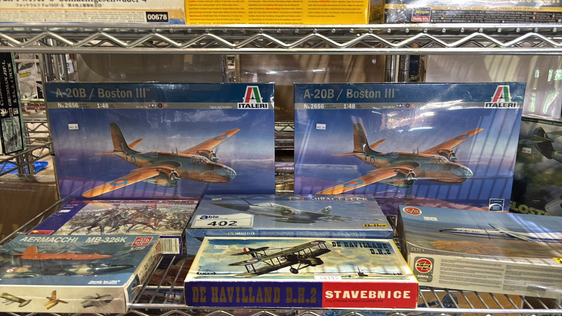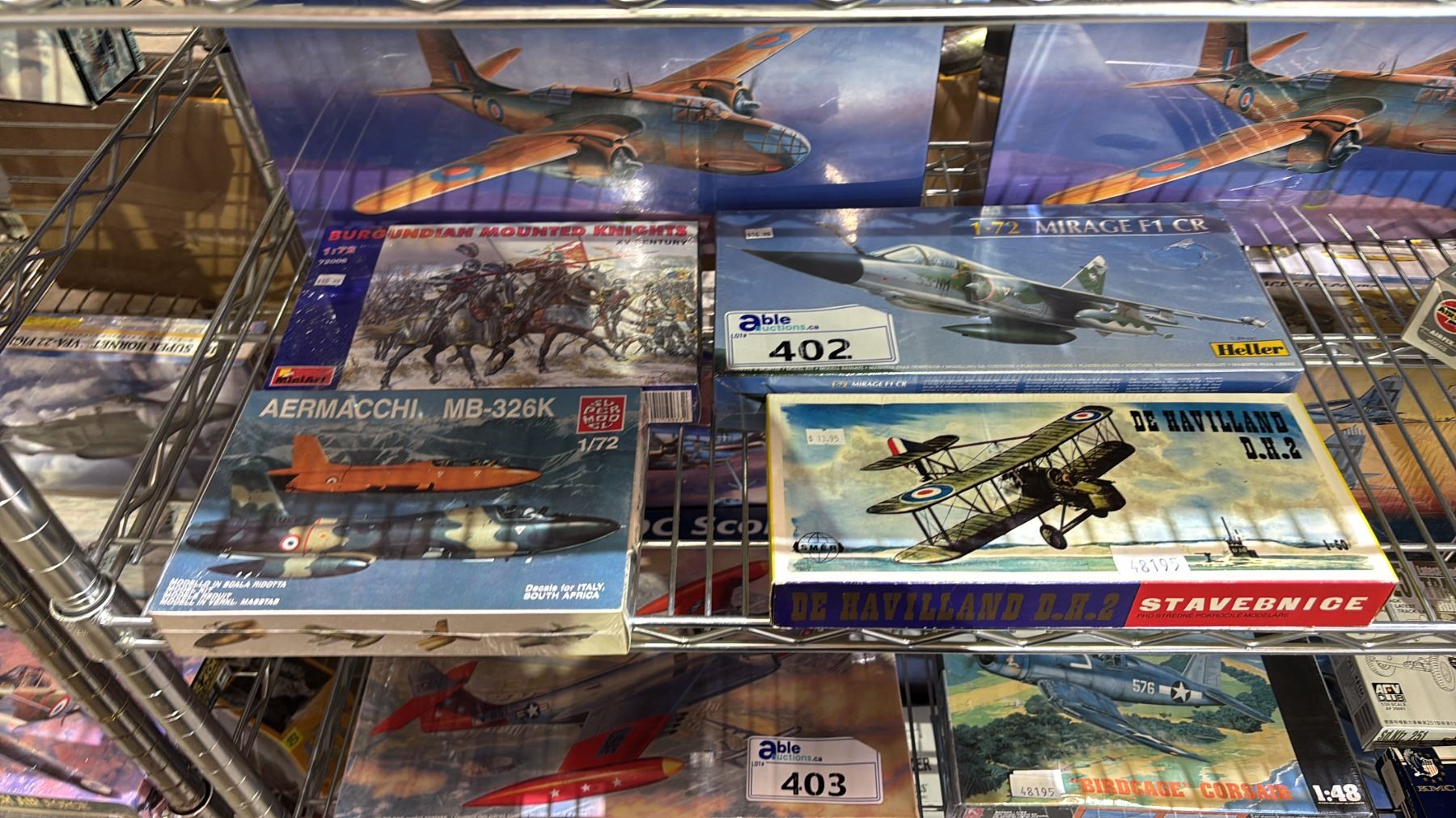 SHELF OF ASSORTED AIRPLANE MODEL KITS & BURGUNDIAN MOUNTED KNIGHTS