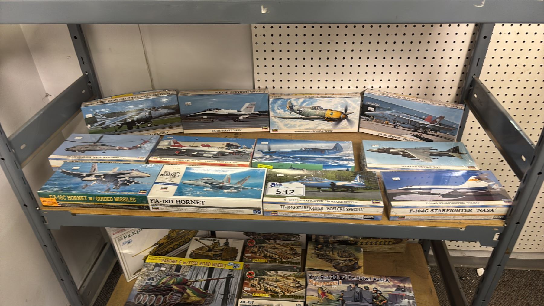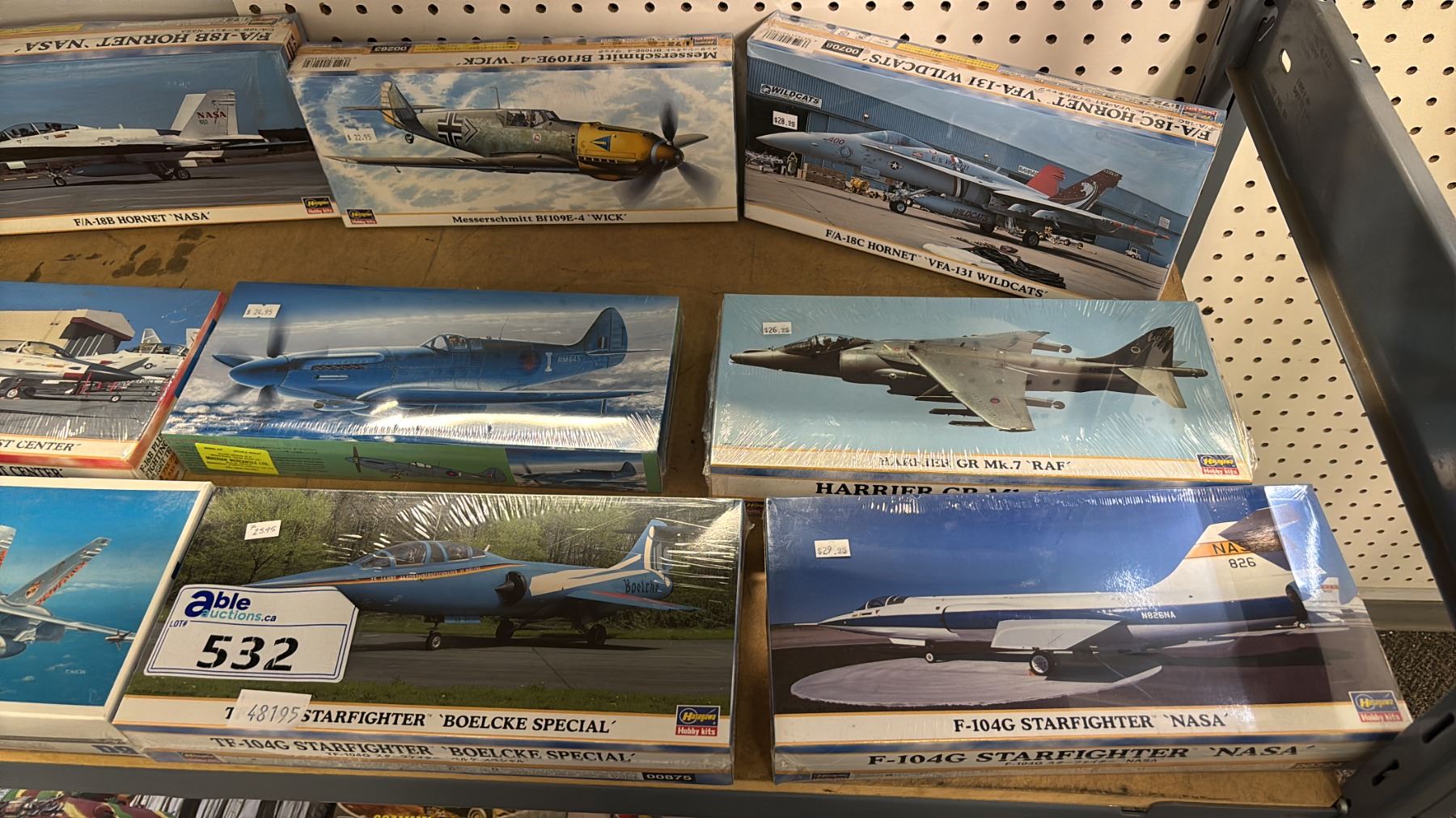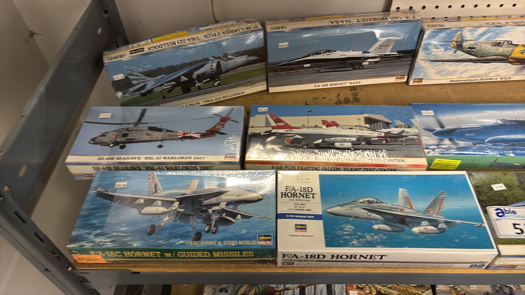 SHELF OF ASSORTED AIRPLANE MODEL KITS