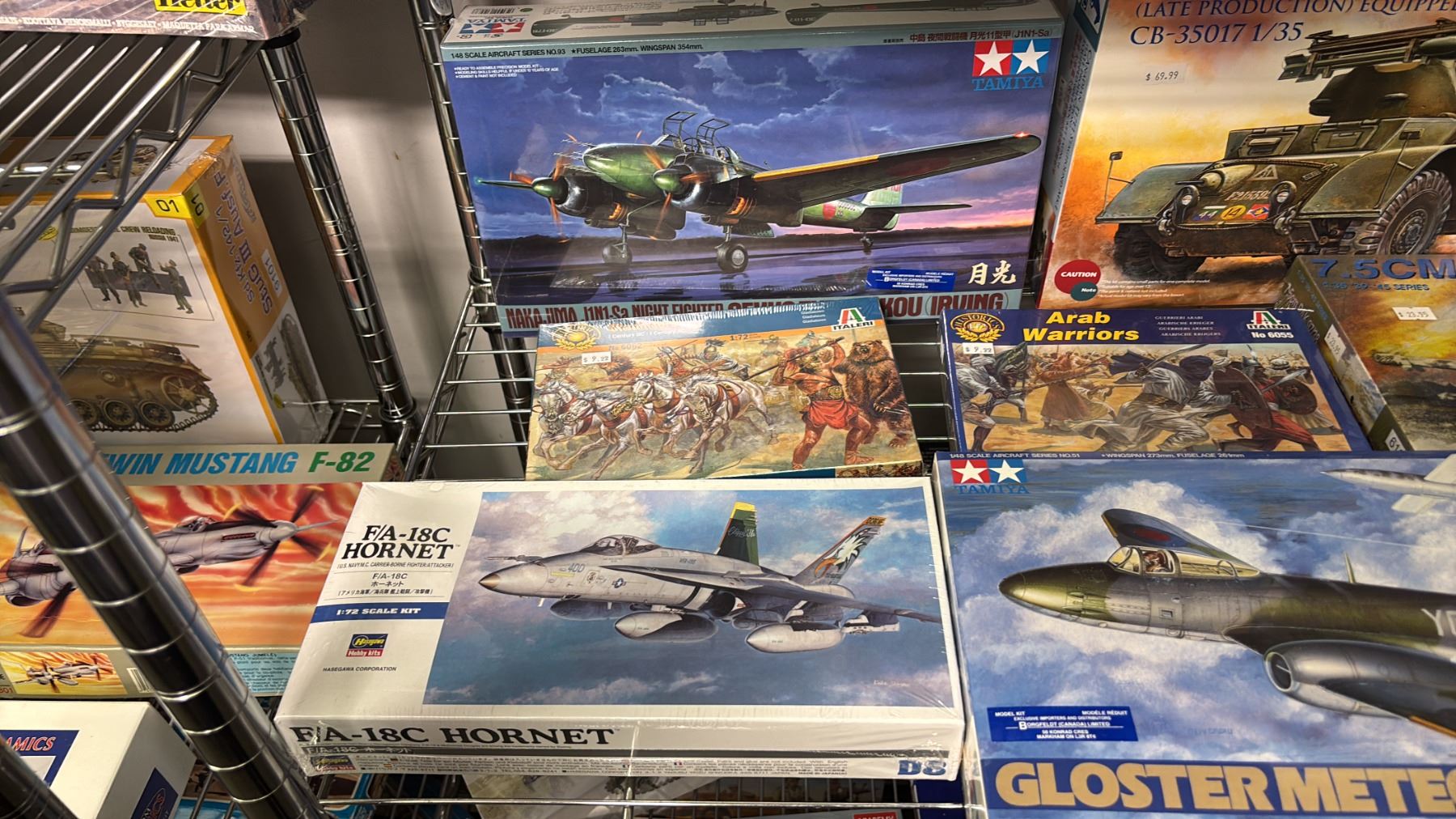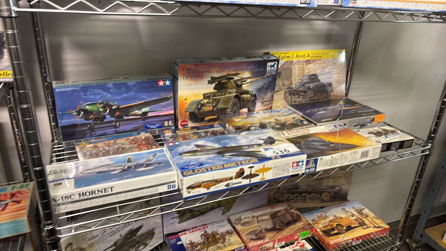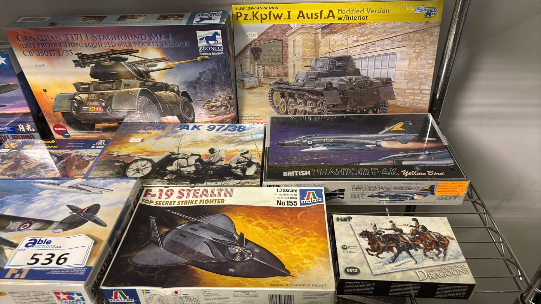 SHELF OF ASSORTED AIRPLANE, TANK & FIGURE MODEL KITS