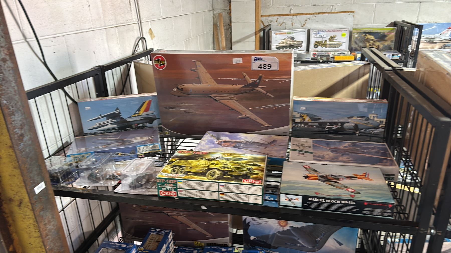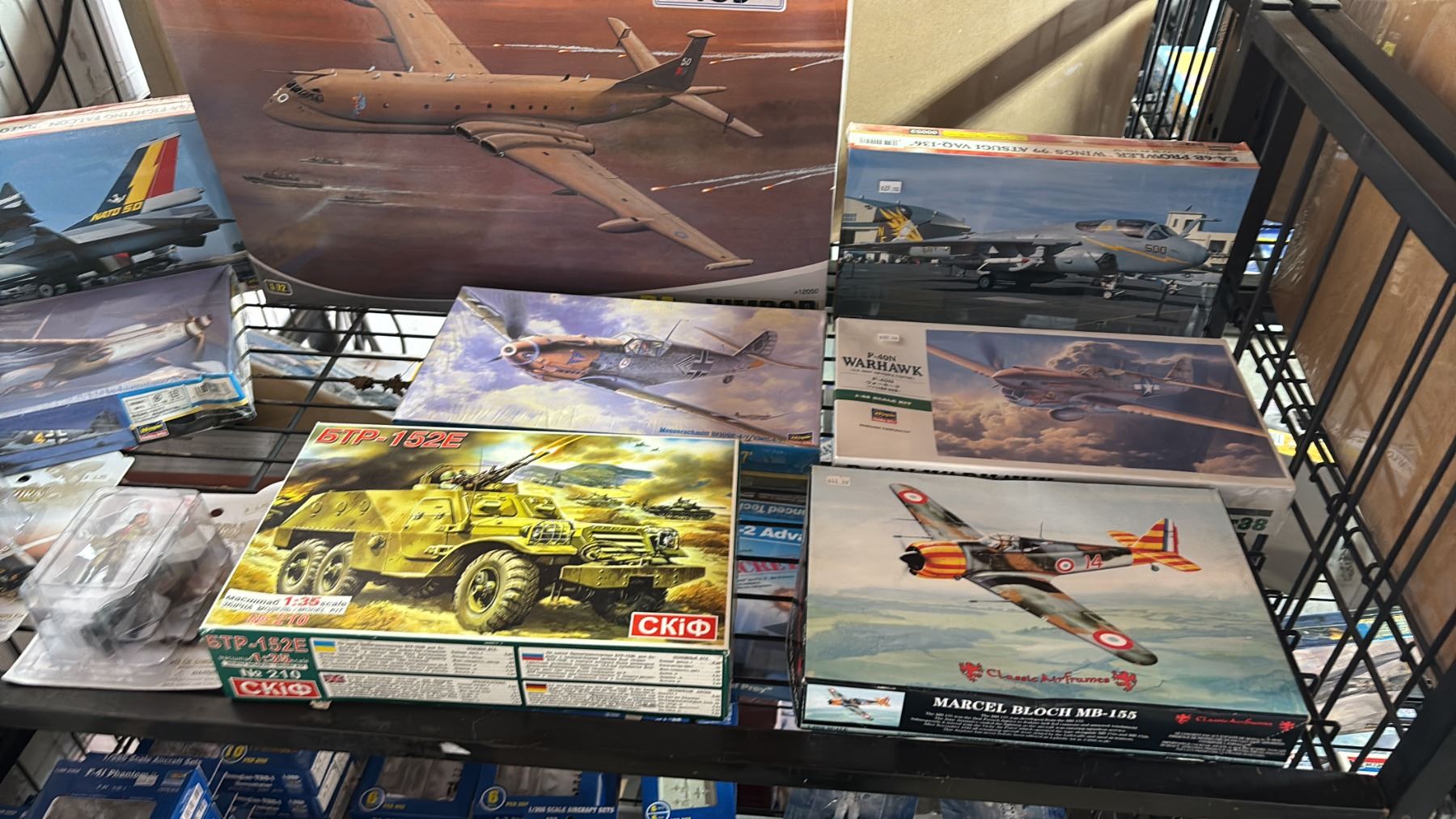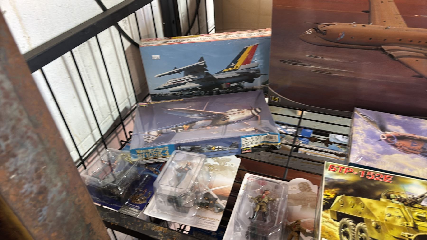 SHELF OF ASSORTED AIRPLANE & TANK MODEL KITS & ASSORTED FIGURINES