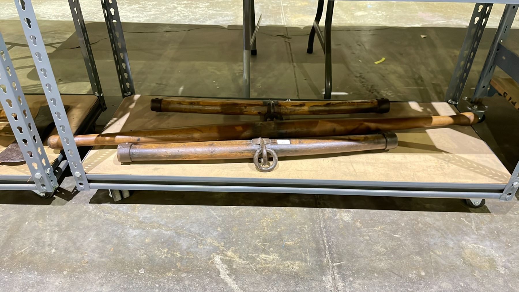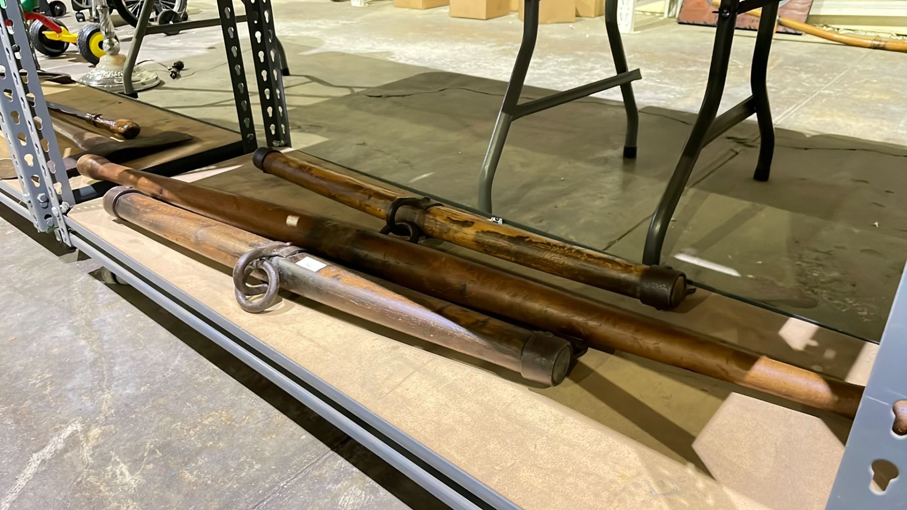 SHELF OF ASSORTED ANTIQUE FARM HARNESS PLOW WOOD & IRON CROSS BARS
