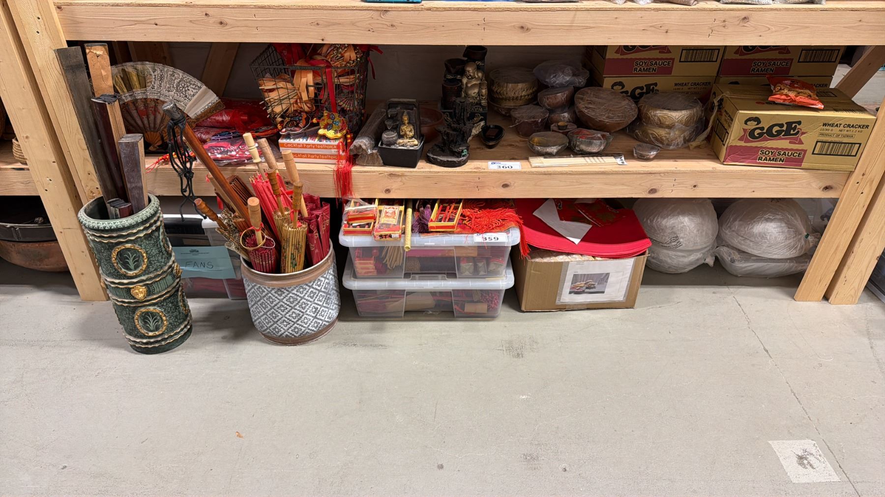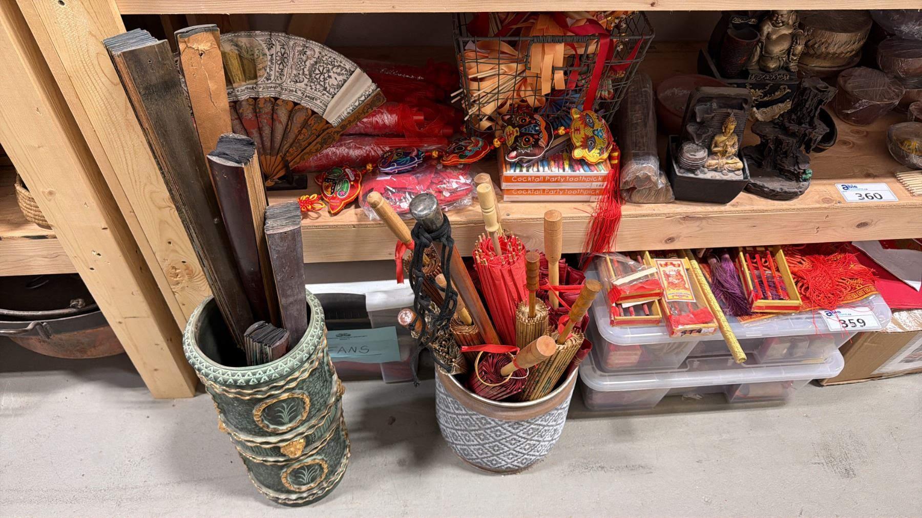 SHELF OF ASSORTED ASIAN UMBRELLAS, FANS, INCENSE & MORE