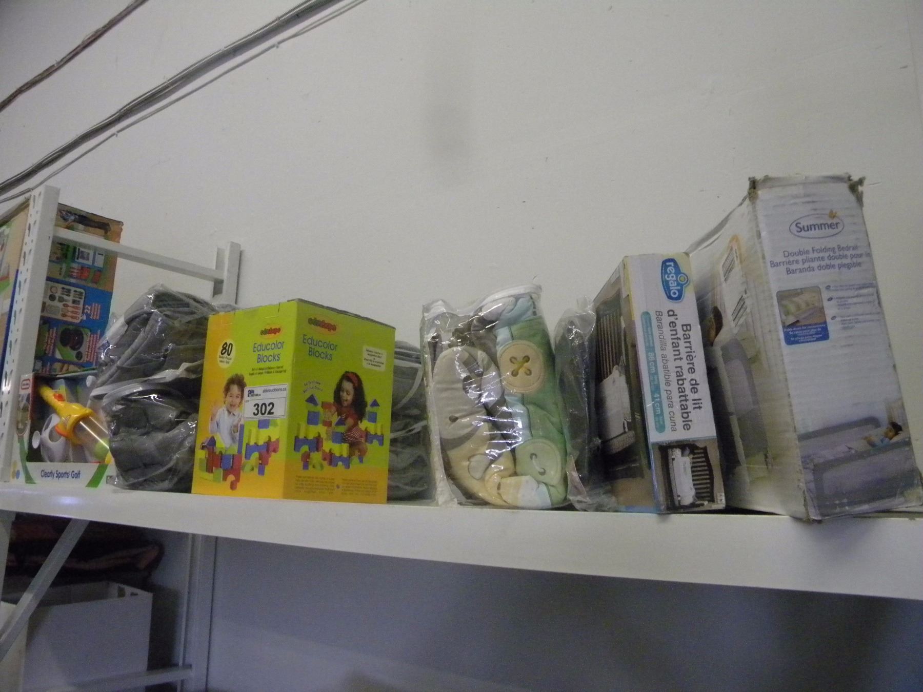 SHELF OF ASSORTED BABY ITEMS INCLUDING CRIB SET/BLOCKS/BABY MIRROR/CRIB SAFTEY RAILS