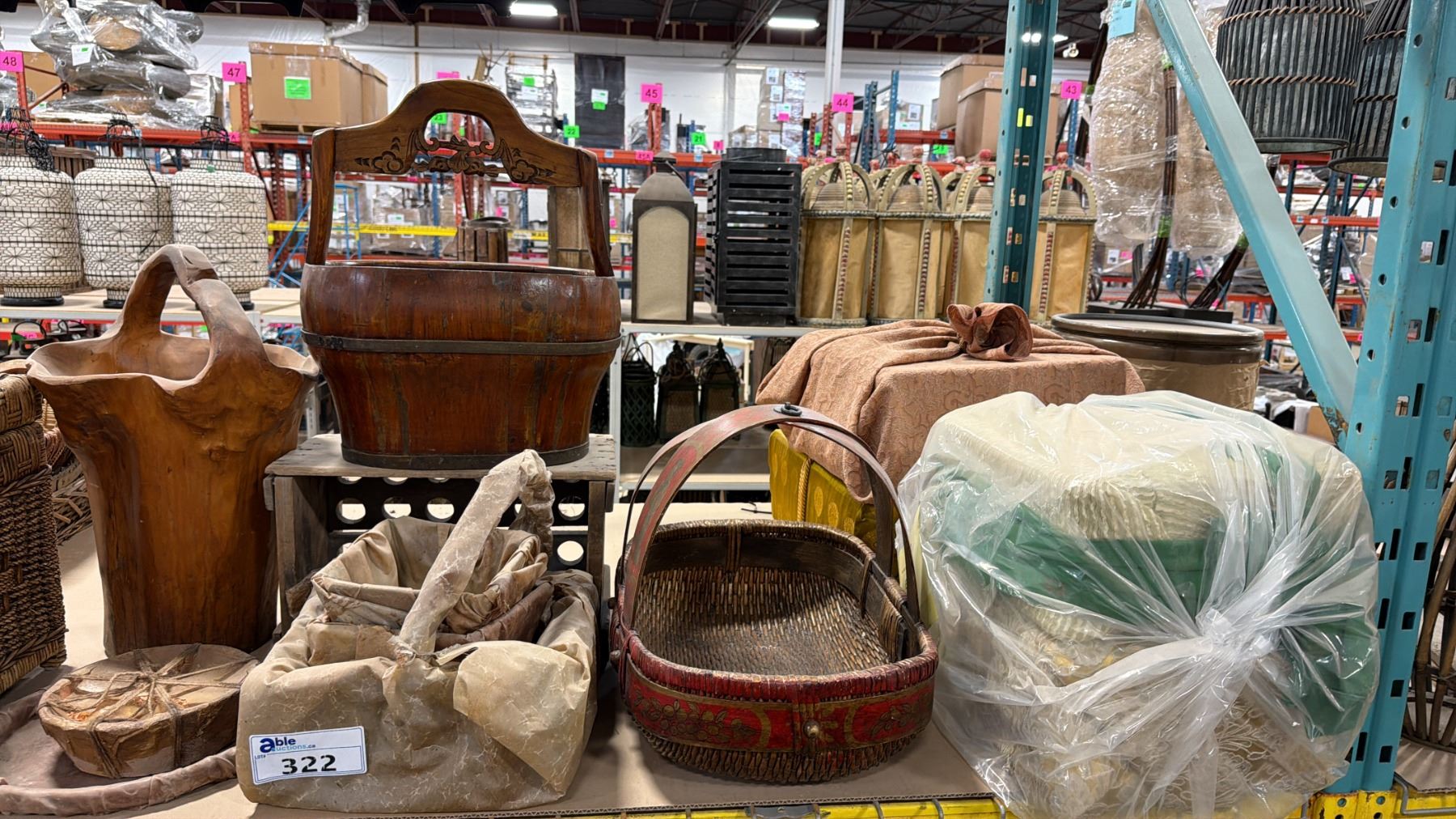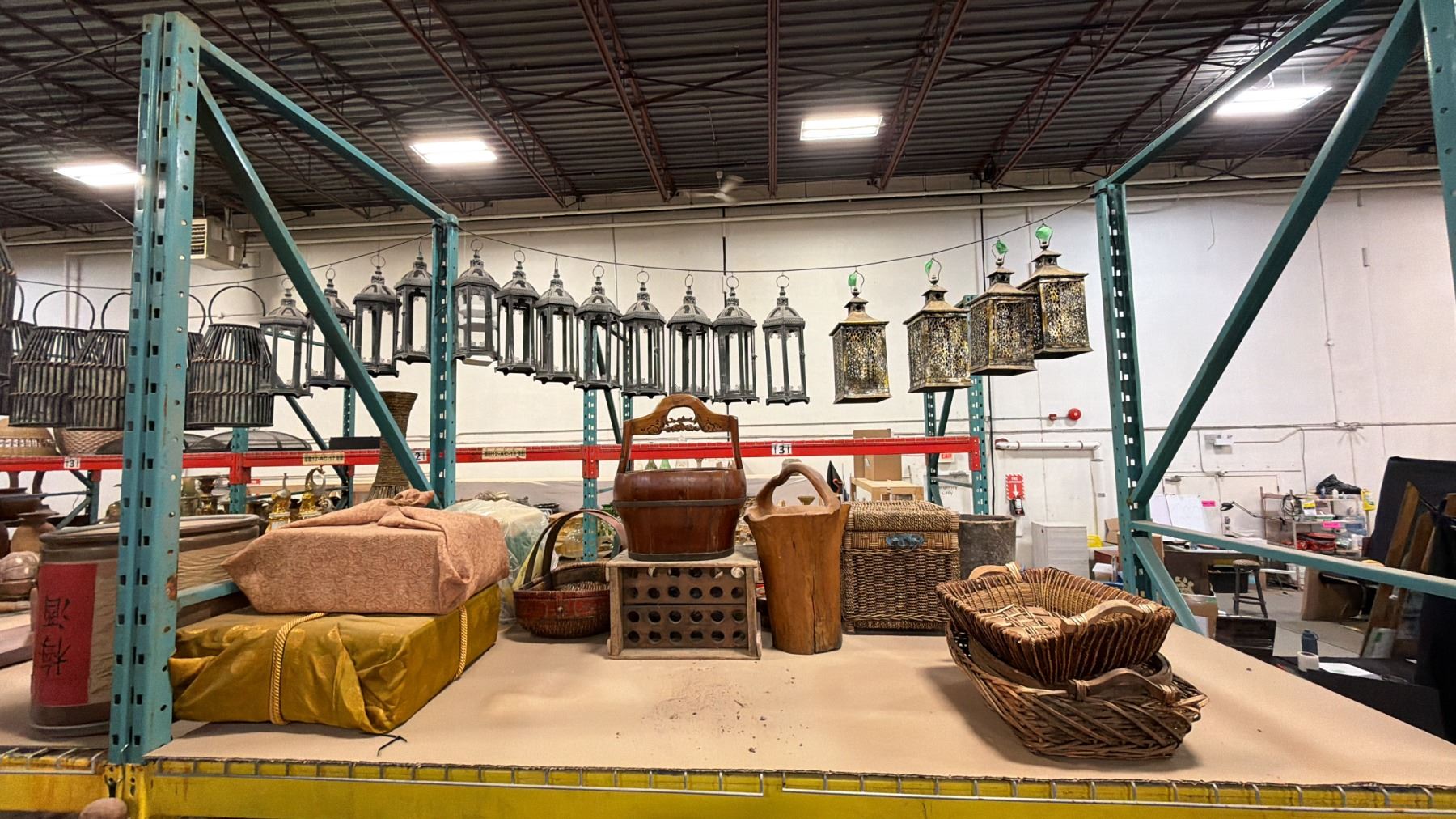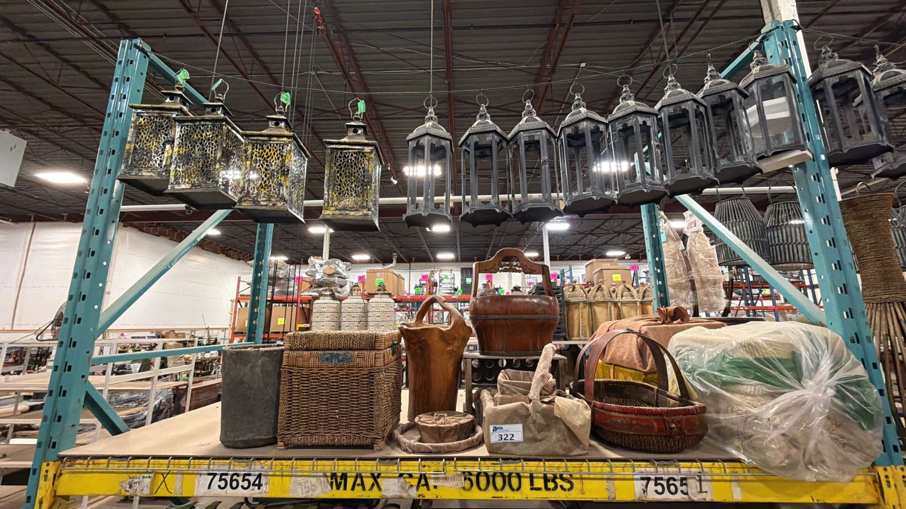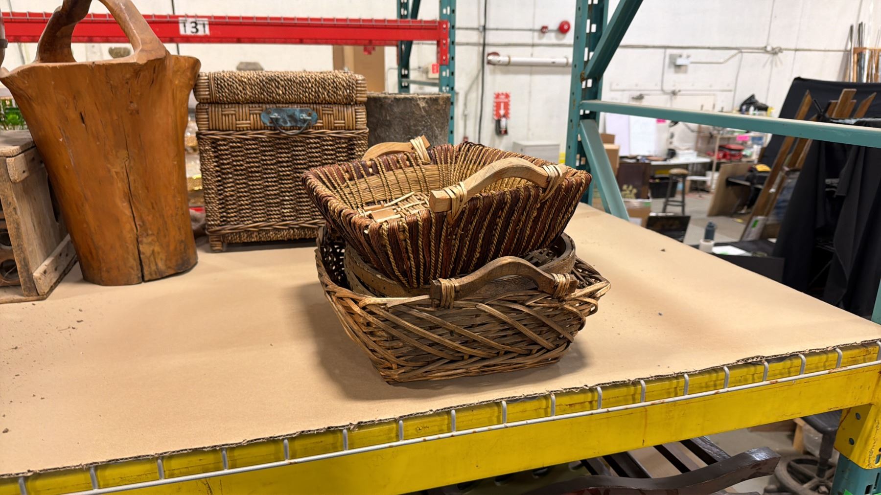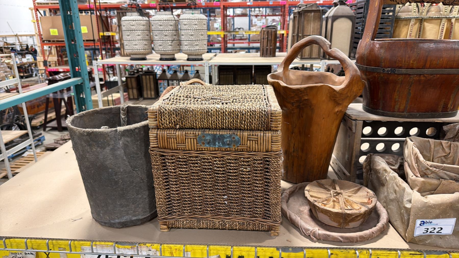 SHELF OF ASSORTED BASKETS, CARVED BUCKETS, CHINESE LANTERNS & MORE